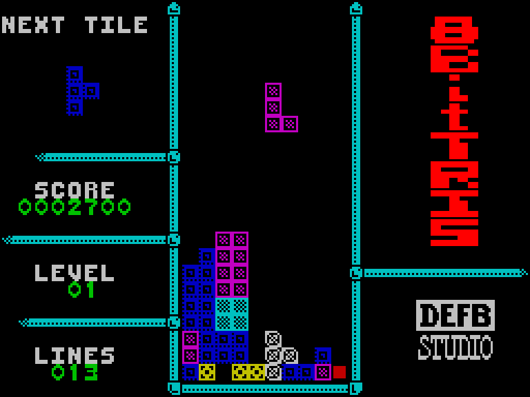 Клон «Тетриса». Выглядит нормально, но управляется так себе — фигуры движутся влево и вправо очень медленно, клавиша падения «залипает» (то есть одна фигура упала, а вторая начинает быстро падать за ней), поменять клавиши нельзя, «отскок от стены» отсутствует, музыки нет, звуковых эффектов тоже... Зато очки начисляются более-менее нормально (за очистку четырёх линий сразу выдаётся куда более весомый бонус, чем за очистку трёх) — и то хлеб.
