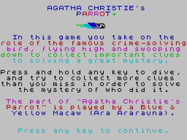Очень простая игра, в которой нужно управлять «знаменитым попугаем-детективом» и собирать улики. При чём тут попугай, понять затруднительно — видимо, это намёк на схожесть в английском языке слов Poirot и Parrot, а то и вообще отсылка к эпизоду «Исчезновение господина Давенхайма» известного британского сериала с Дэвидом Суше в главной роли.