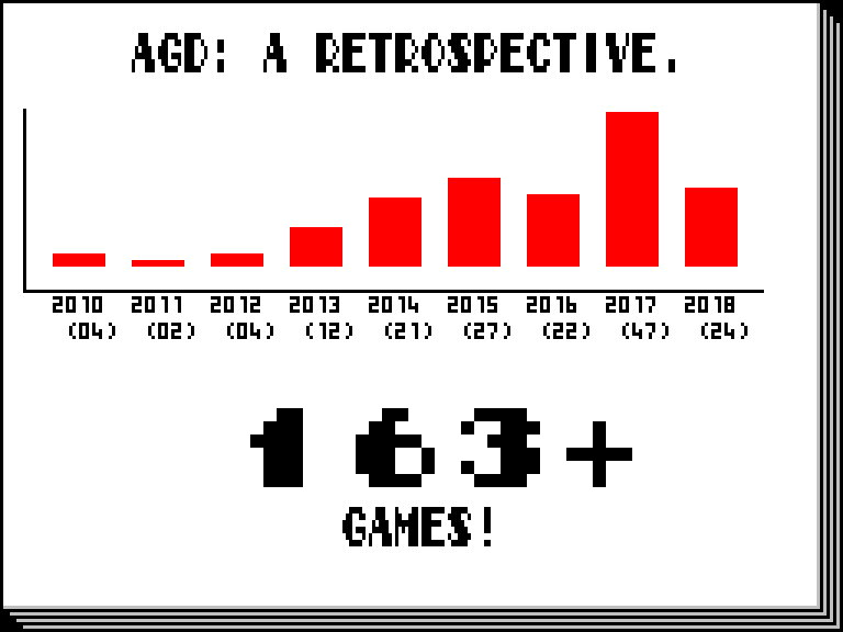 Не совсем игра, а, скорее, энциклопедия игр, созданных при помощи движка AGD. Да и слово «энциклопедия» тут не очень подходит — о каждом релизе сказана буквально пара слов, плюс указан рейтинг и показан спрайт главного героя. Зато игр в AGD Compendium аж целых 163 штуки — есть даже поделки Джейми Грилло.