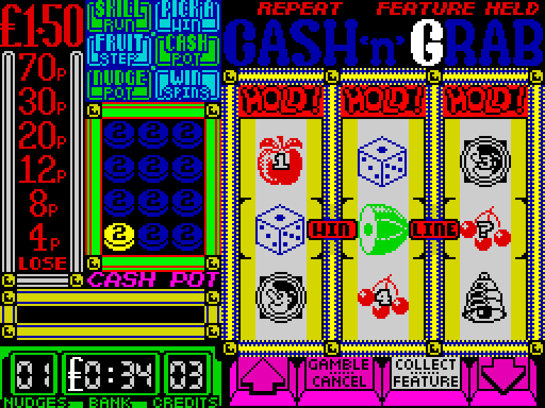Это типичный симулятор слот-машины, которую ещё частенько называют «одноруким бандитом». На экране крутятся три барабана с изображениями фруктов, колокольчика и цифры «7», а вы кидаете в автомат деньги и дёргаете за рычаг в надежде, что выпадет нужная комбинация символов.