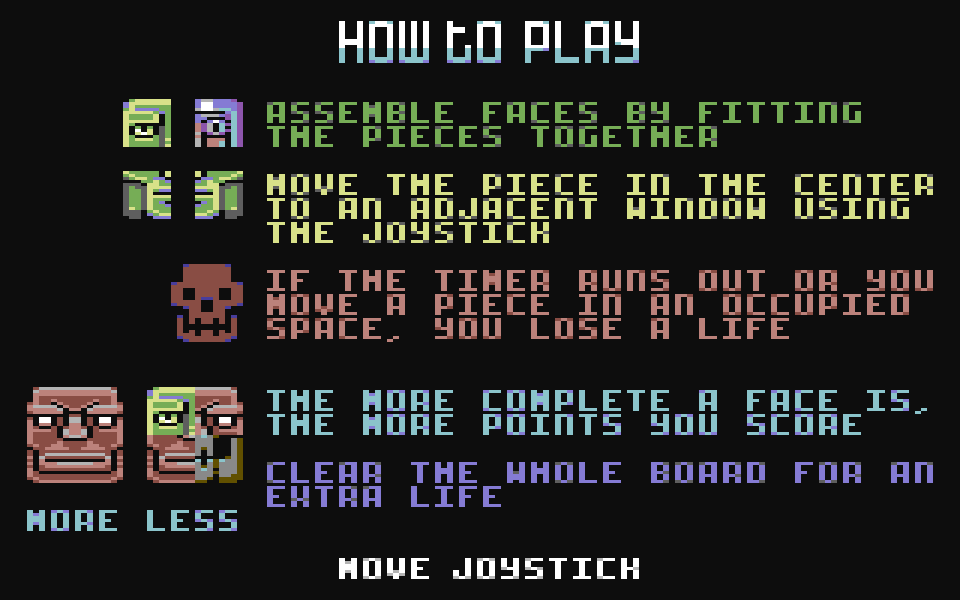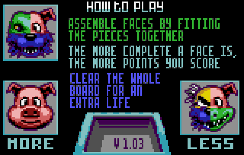 Цель игры — составлять головы разных причудливых существ из подкидываемых компьютером кусочков. Оных может быть всего четыре штуки — два верхних и два нижних. Фрагменты бывают четырёх цветов, и хотя необязательно составлять целую голову из одноцветных кусков, это помогает заработать больше очков.