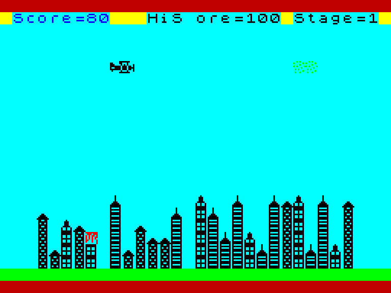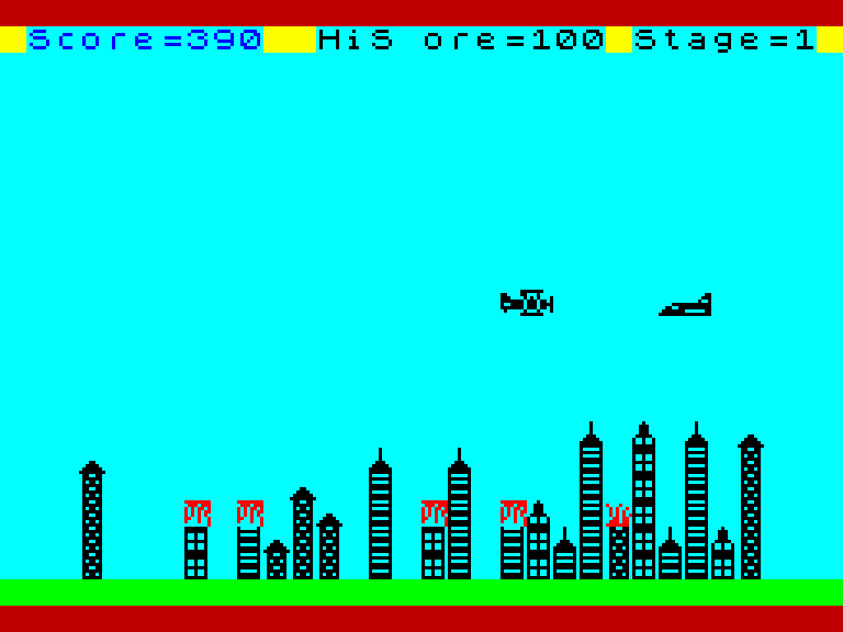 Классический «Бомбер» (или Blitz, кому что ближе), но с небольшим отличием — иногда навстречу вам летит вражеский самолёт, который нужно сбить нажатием любой клавиши. В остальном суть та же — летите, бомбите здания в чужом городе, постепенно снижаетесь и стараетесь ни во что не врезаться.