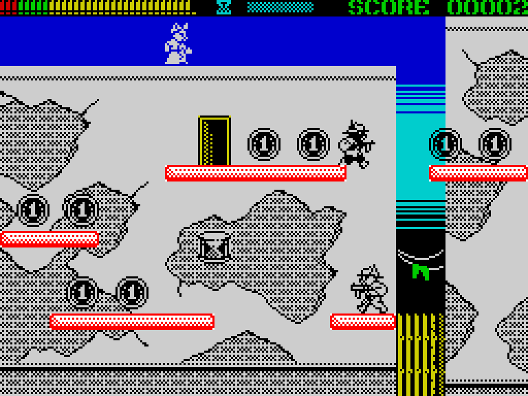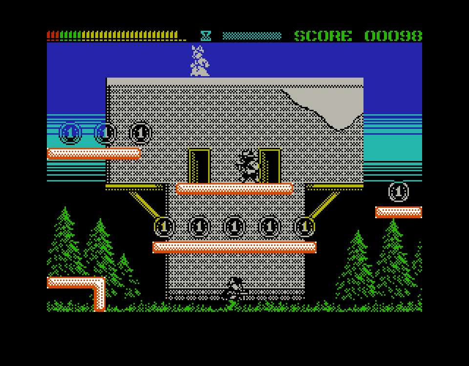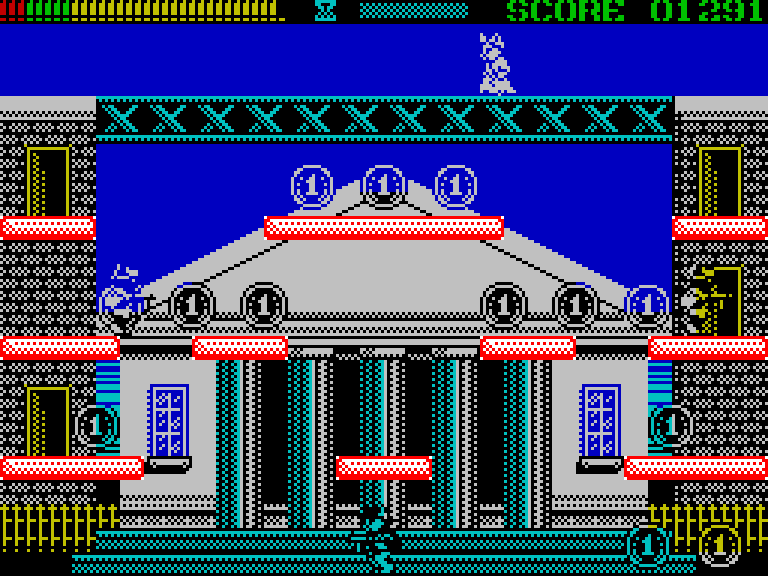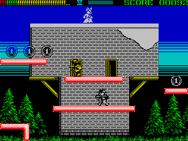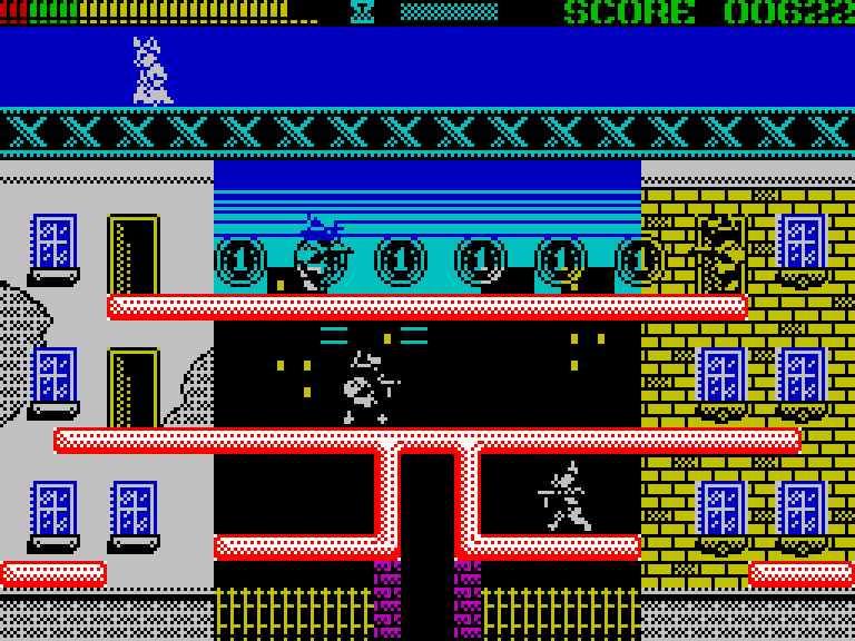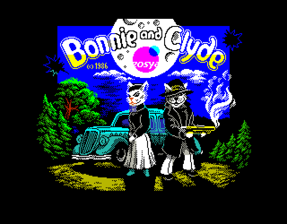 В этом экшен-платформере для ZX Spectrum вы играете за кота по имени Клайд, который на пару с кошкой Бонни занимается именно тем, чем занимались их печально знаменитые прототипы — грабежом средь ясного дня! Клайд бегает по экрану с автоматом, отстреливается от врагов и собирает монетки, а Бонни кидает ему сверху всякие полезные штуки — ящики с пулями, песочные часы для обнуления таймера и так далее. Когда Клайд соберёт все монетки, на экране появится сейф, а Бонни кинет сверху взрывчатку. Её надо будет поймать, взорвать сейчас, забрать мешок с деньгами (это опционально) и вскарабкаться наверх по спущенной лестнице. И так — 90 раз подряд, аккурат по количеству экранов.