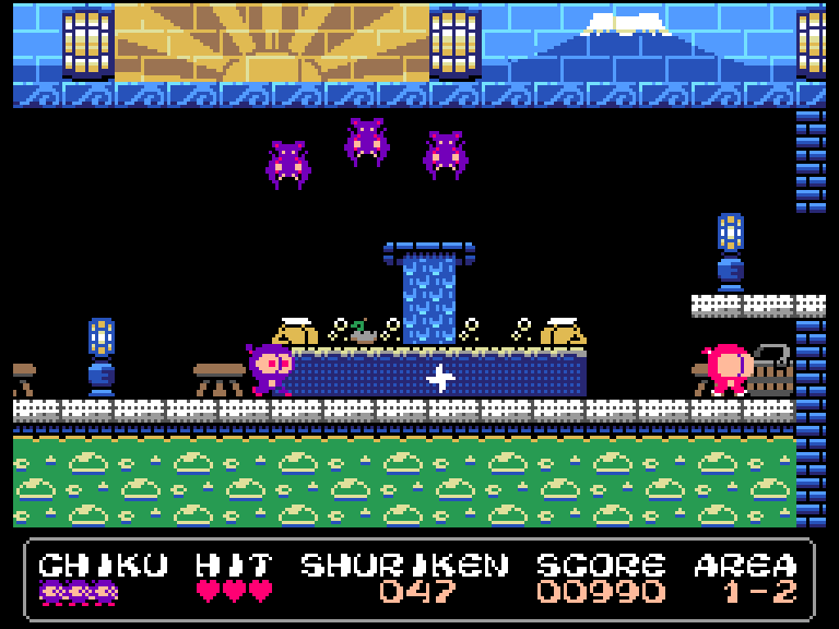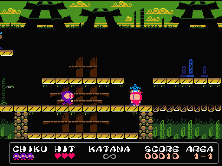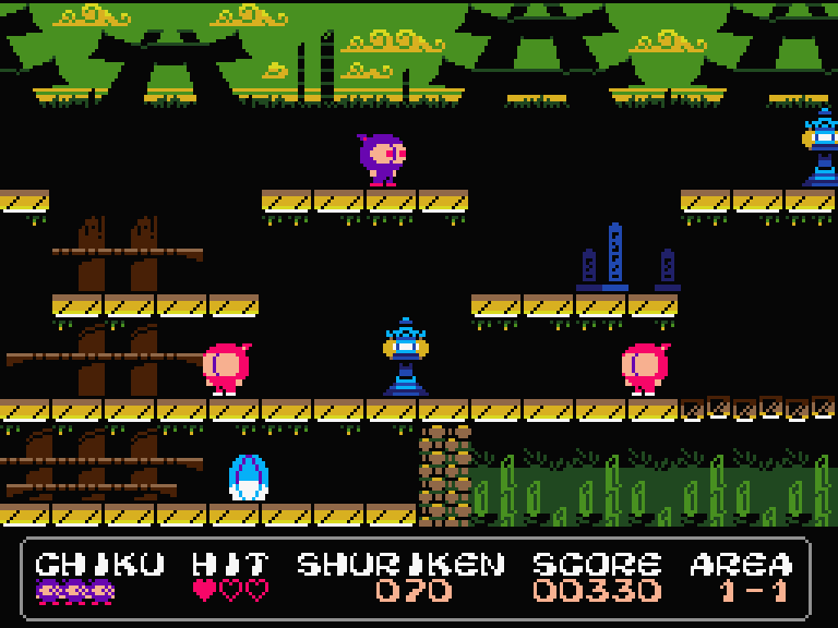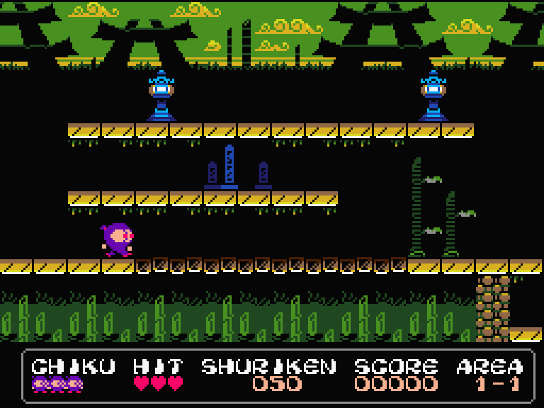 Наполовину платформер, наполовину скролл-шутер для MSX2. Платформер — потому что главный герой реально только и делает, что скачет вверх-вниз по платформам, ну и бегает вперёд-назад, чтобы не сталкиваться с врагами. А от скролл-шутера игре достался постоянный плавный горизонтальный скроллинг и стрельба по врагам сюрикенами. Правда, они имеют обыкновение заканчиваться, и тогда скролл-шутер превращается в скролл-слэшер — катану-то у главного героя никто не забирал.