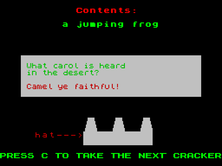 Симулятор рождественских хлопушек. Жмите на пробел, чтобы очередная хлопушка лопнула, оставив вас наедине с плохонькой шуткой и бесполезным подарком. Что ж, в этом даже есть своё очарование, хотя совершенно точно нет геймплея.