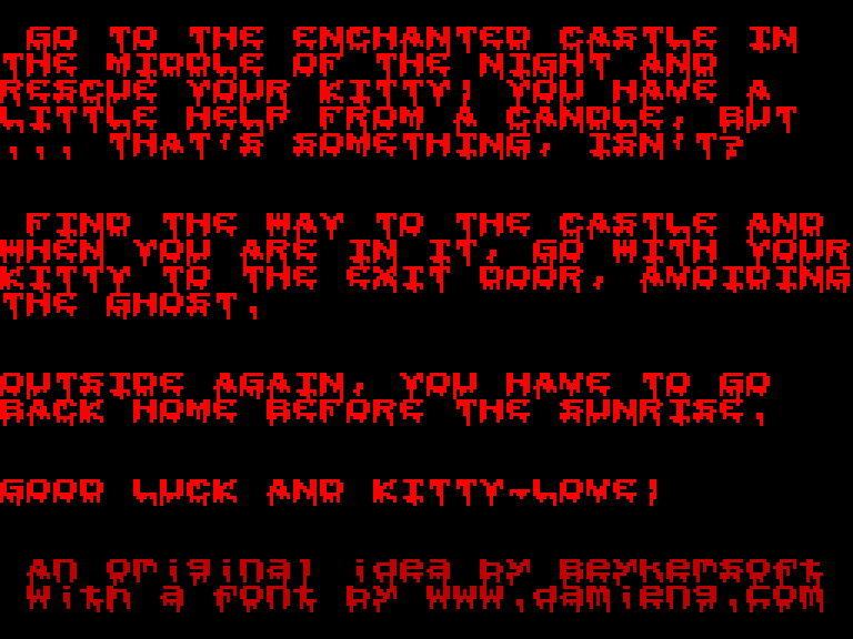 Вы управляете человеком, который тёмной ночью отправляется в зачарованный замок, чтобы спасти своего котёнка. Вокруг не видно ни зги, остаётся рассчитывать лишь на свечу, которая освещает маленькое пространство размером 3×3 квадрата. Одним словом, классический лабиринт с ограниченной видимостью.