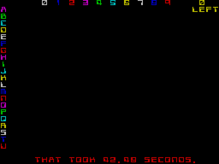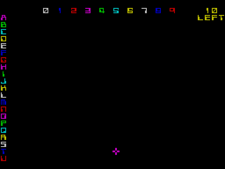 На поле десять раз подряд появляется крестик, и вам нужно как можно скорее нажать одновременно букву латинского алфавита (от «A» до «Z») и цифру (от «0» до «9»), обозначив тем самым строку и ряд, где очутился этот символ. Если все десять нажатий будут верными, то появится суммарное время игры, отражающее скорость вашей реакции.