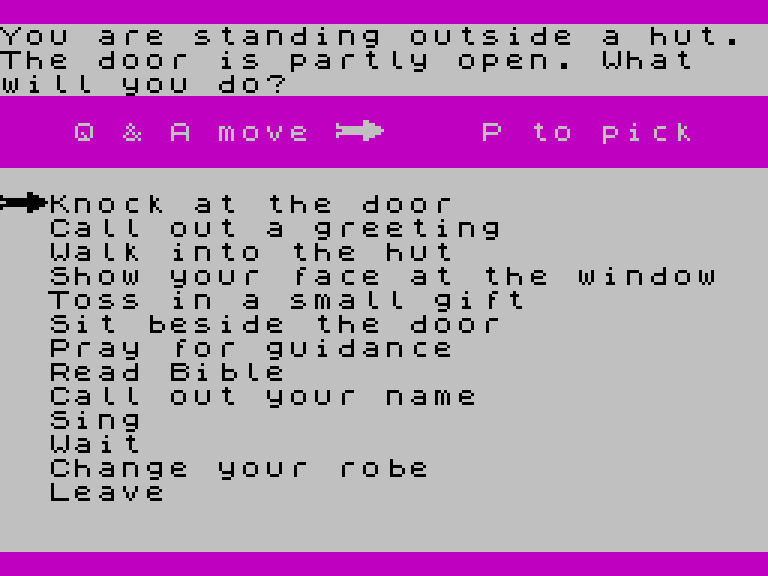 По жанру это что-то вроде приключенческой RPG, в которой вам выпадает роль миссионера, оказавшегося в землях трёх племён — каждое со своими особенностями и обычаями. Вам нужно изучить культуру этих дикарей и, разумеется, познакомить их со Словом Божьим.