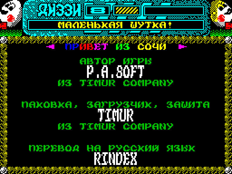 Игра вышла в 1995–1996 годах. Некоторые ушлые продавцы на радиорынках пытались втюхать её покупателям как «Настоящего Диззи-8», но к тому моменту вышло уже слишком много отечественных «Диззи», так что мало кто на это вёлся. А изначально её сделал некто P.A. Soft из группы Timur Company — «специально для сочинских хакеров и программистов».