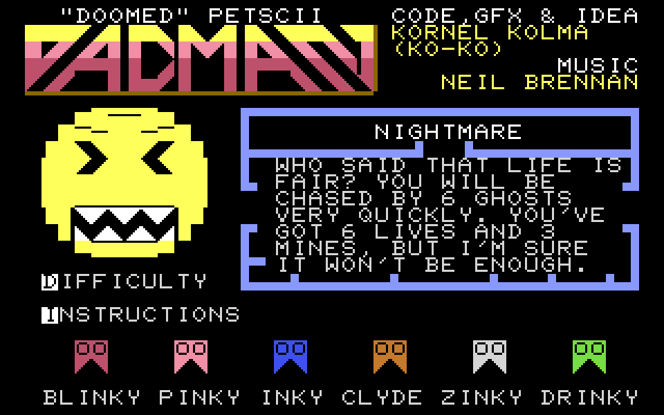 https://ko-ko74.itch.io/doomed-petscii-pacman-c64 (C64)