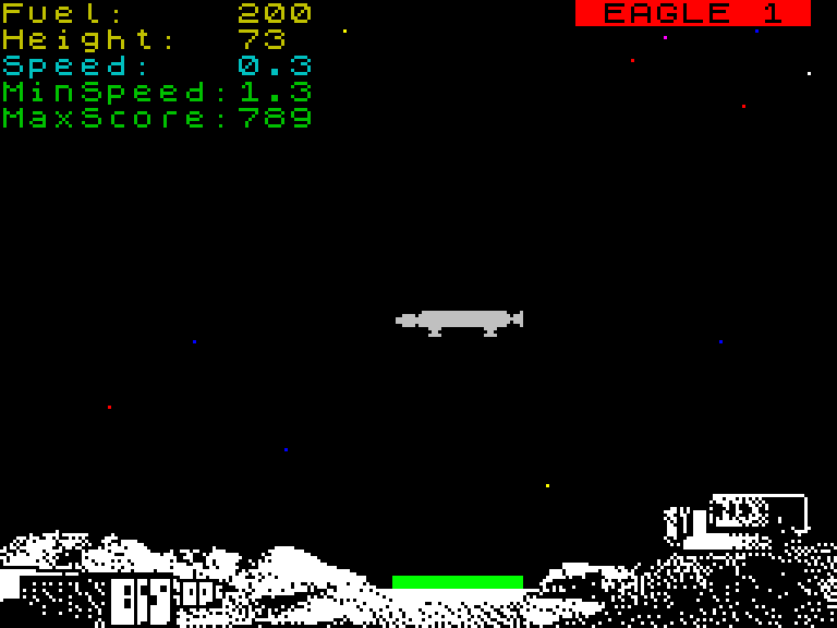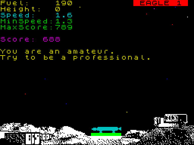 Аркада в стиле Moon Lander, где вам нужно посадить космический корабль на платформу. Правда, нет ни «космического ветра», ни возможности развернуть свой корабль — есть только управление двигателем. Если посадить корабль идеально — вас похвалят. Если абы как — назовут любителем. Если разбить — поругают.