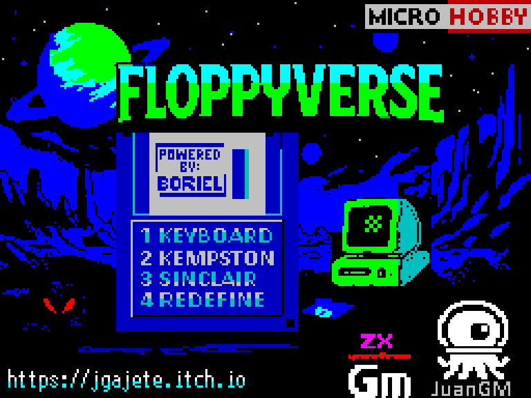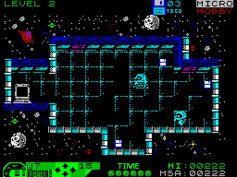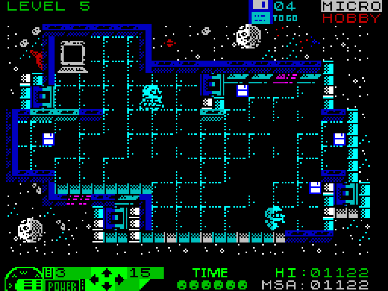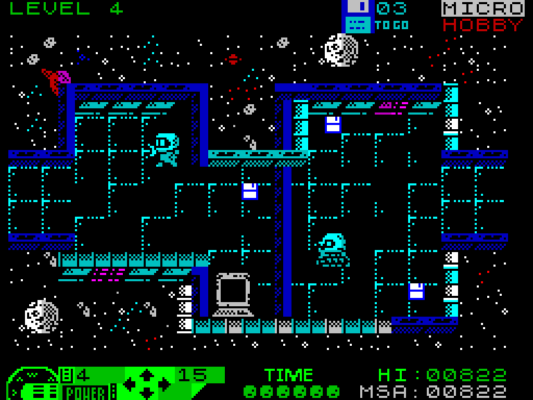 Одна из немногих игр на движке ZXGM, в которые можно играть, потому что это не аркада, а больше головоломка. Здесь нужно собирать дискеты, не сталкиваясь с врагами. Процесс усложняется тем, что главный герой передвигается как Пакман.