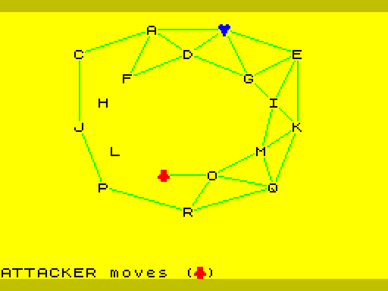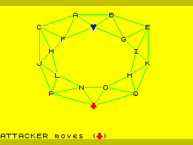 Суть игры в следующем — две фишки (атакующая красная и обороняющаяся синяя) перемещаются по фигуре из букв, связанных между собой линиями, и пытаются слопать друг друга. Фактически, если вы оказались рядом с фишкой соперника и сейчас ваш ход — вы победили. При этом синяя фишка может перемещаться лишь по буквам «A», «B» и «C», а красная имеет право ходить куда угодно, но всего один раз, поскольку линия за ней сразу исчезает.