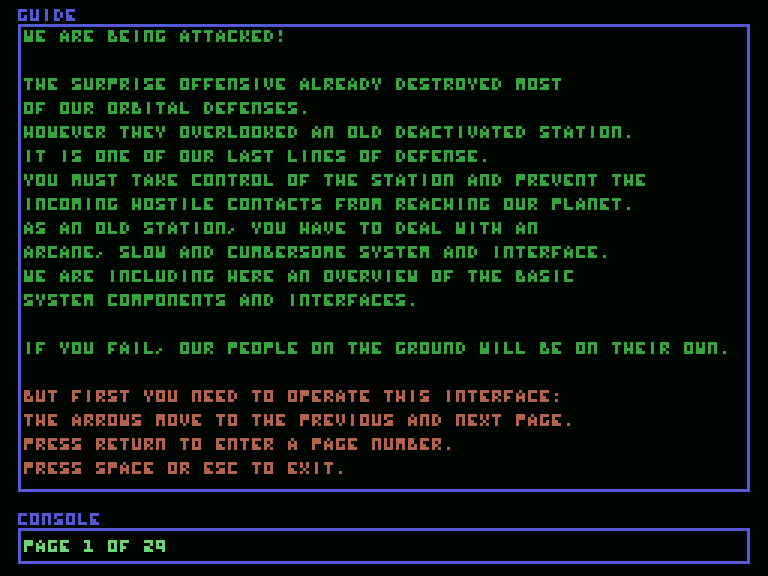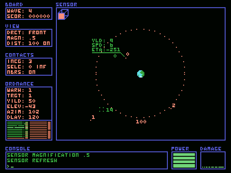 В этой игре вы управляете боевой станцией, основной задачей которой является обнаружение и уничтожение вражеских целей с помощью настраиваемых боеголовок. Интерфейс — сложный и многоуровневый: игроку предстоит взаимодействовать с устаревшей консольной системой, анализировать показания сенсоров, отслеживать состояние вооружения, энергетических систем и повреждений.