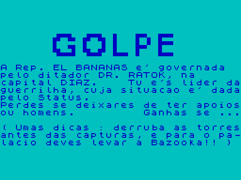 Политическая стратегия, в которой, судя по всему, нужно совершить военный переворот. Для достижения этой цели нужно заручиться поддержкой населения и вояк — меню игры достаточно разнообразное, и если вы хорошо знаете португальский, то вряд ли в нём потеряетесь.