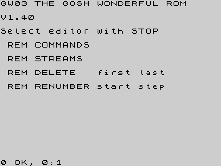The Gosh Wonderful ZX Spectrum ROM понимает и несколько новых команд — их надо писать после стандартного оператора REM. Также автор решил исправить несколько наиболее вопиющих ошибок встроенного спектрумовского Бейсика.