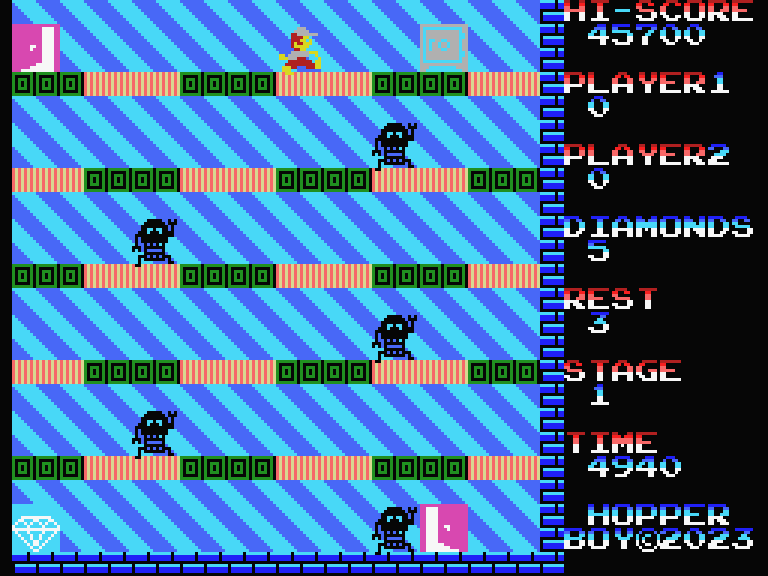 Hopper Boy — аркадная игра в духе классических Game & Watch, где игроку предстоит собирать бриллианты в здании банка и зарабатывать очки. Управляя персонажем, нужно перемещаться между этажами, избегать охранников и доставлять собранные камни в сейф, расположенный на верхнем уровне. Для быстрой переправки наверх можно воспользоваться фиолетовой дверью внизу, которая перемещает героя обратно на верхний этаж.