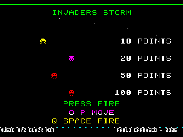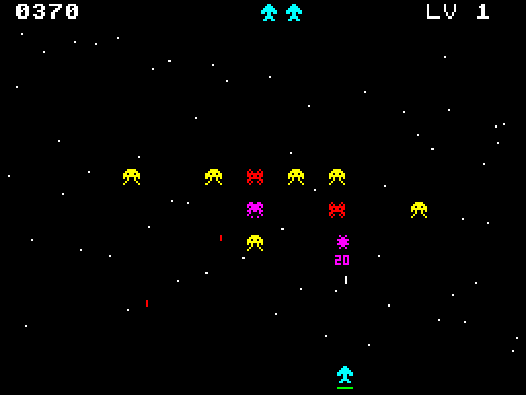 Довольно сложный клон Space Invaders, где у вас нет никакой защиты, а инопланетяне безостановочно поливают вас огнём, в том числе и самонаводящимися ракетами. Играется хорошо, но умирать вы будете часто.
