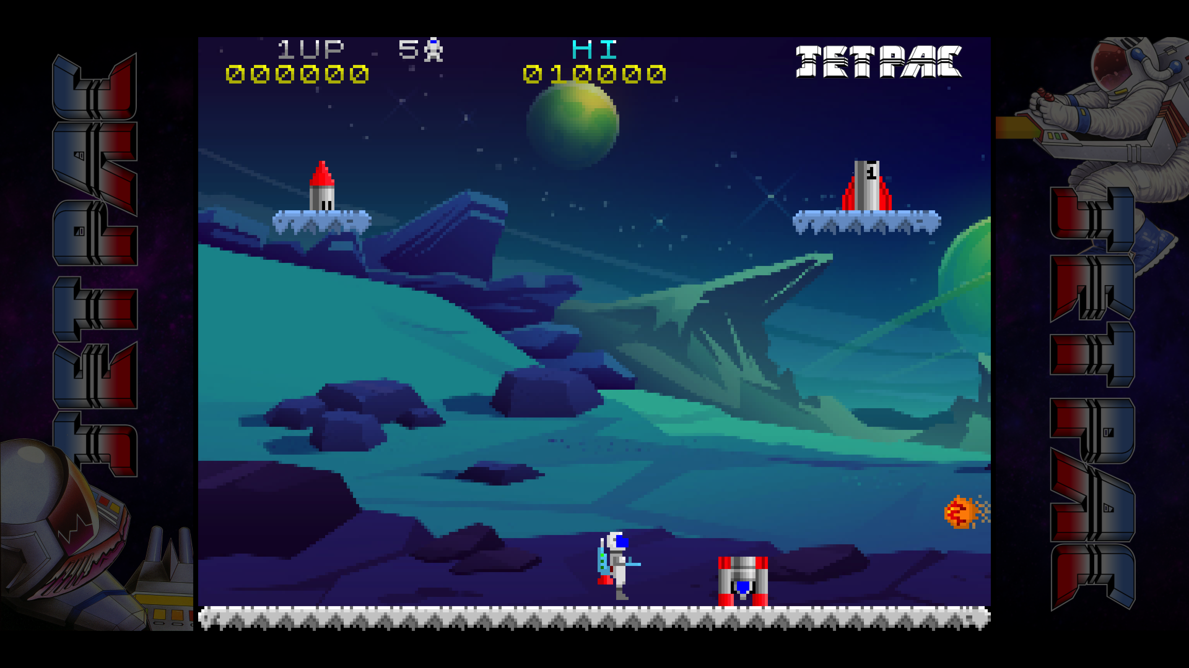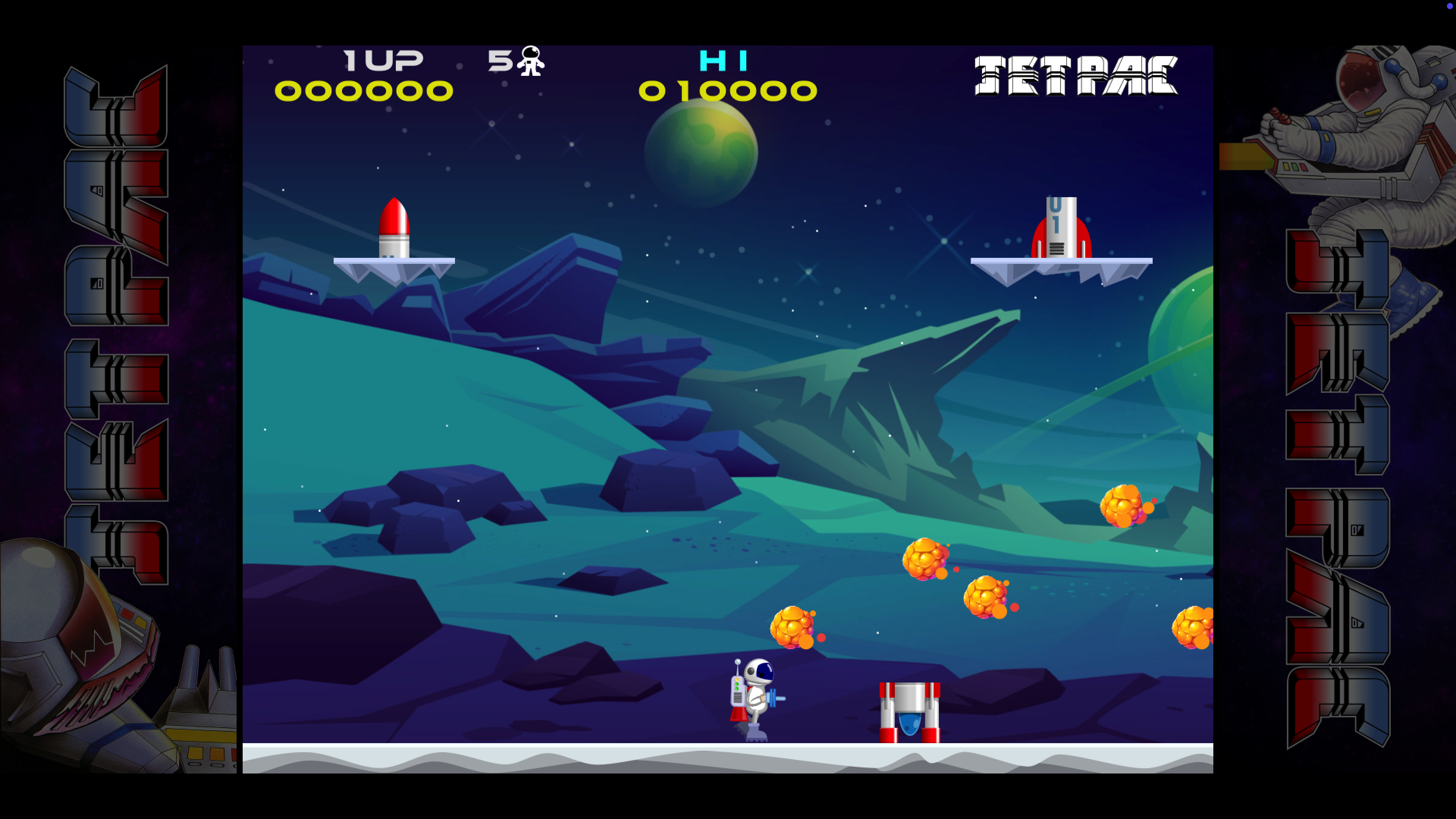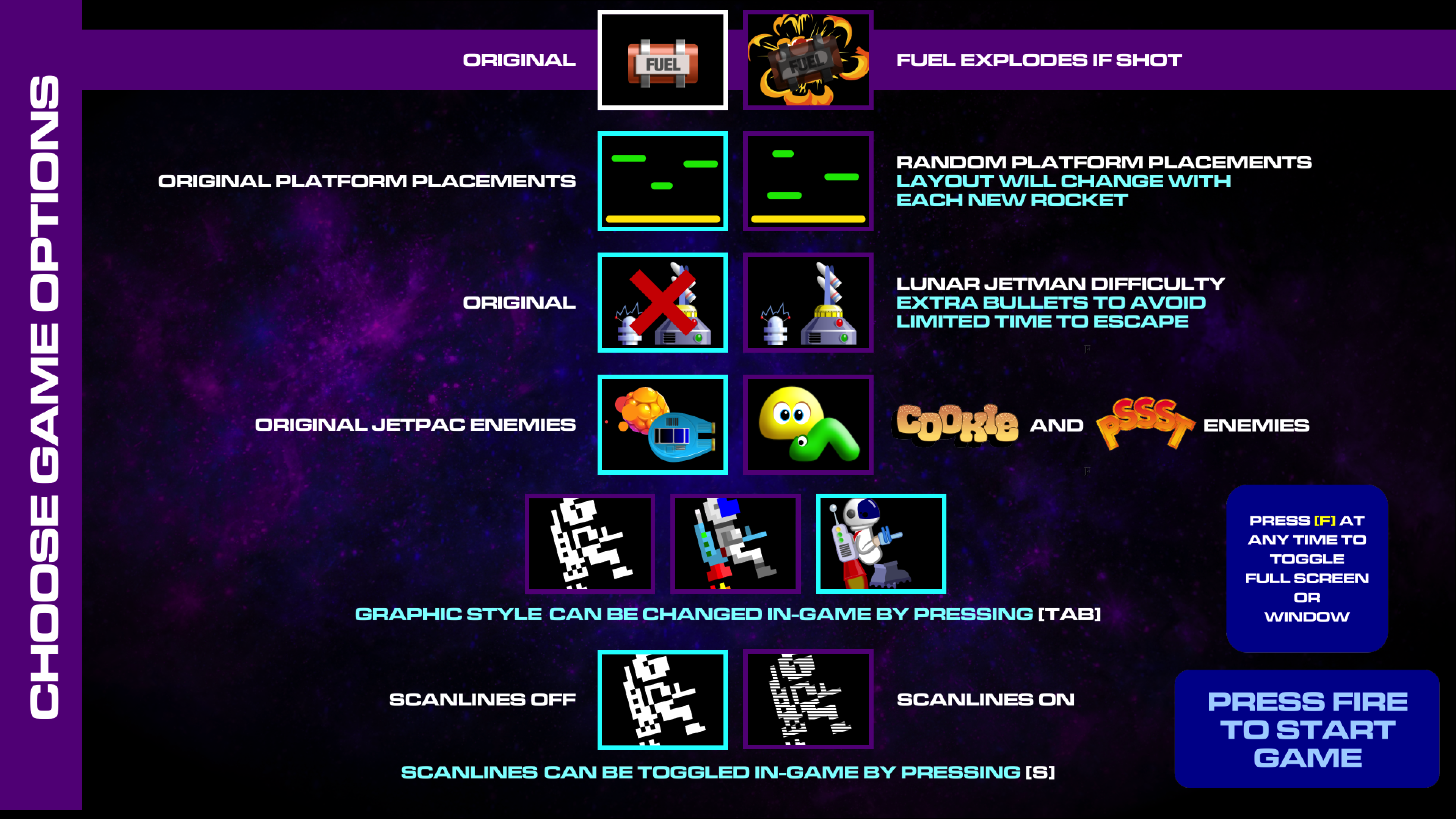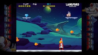 Как водится, разработчик оставил в неприкосновенности геймплей (да, физика джетпака отличается, но не принципиально), но значительно улучшил графику и звук. Более того, теперь нас ждёт не два, а три графических стиля: классический а-ля «Спектрум», современный и промежуточный третий — с пикселявой, но более красочной графикой. Переключаться между режимами можно клавишей Tab, а при желании можно включить сканлайны — клавишей «S».