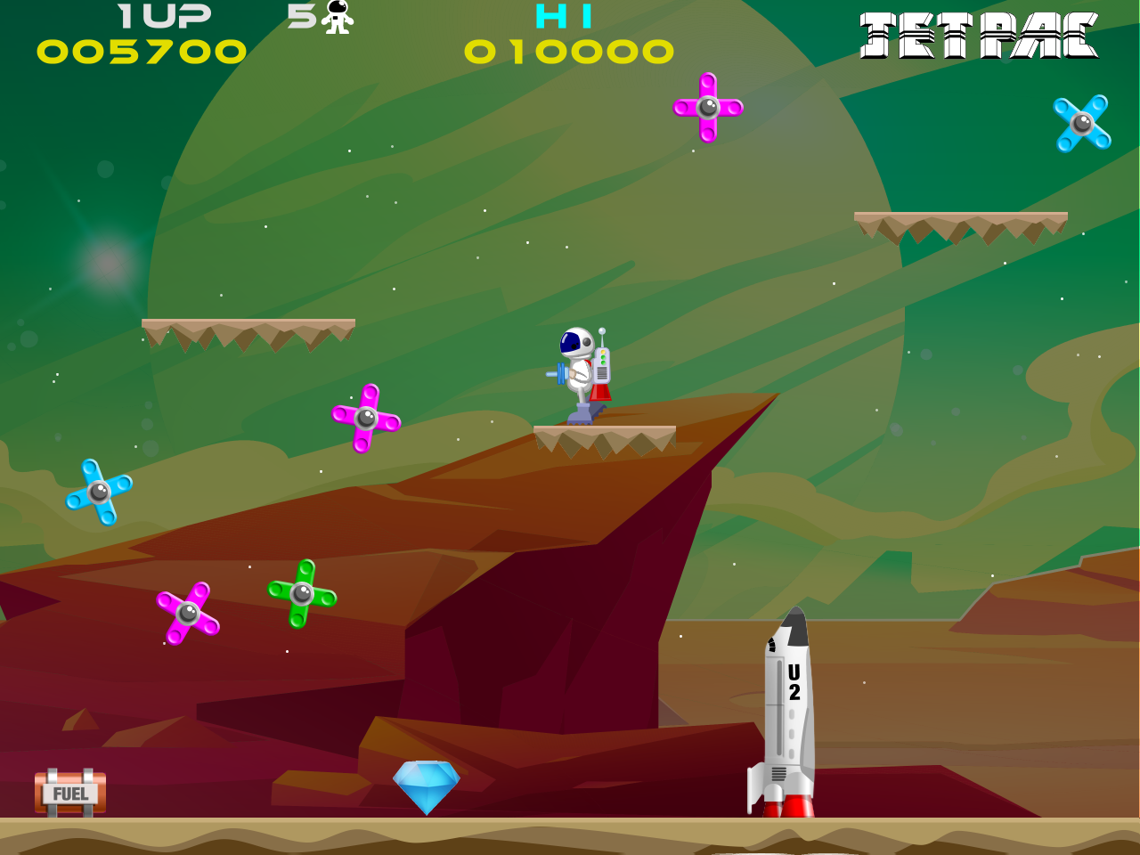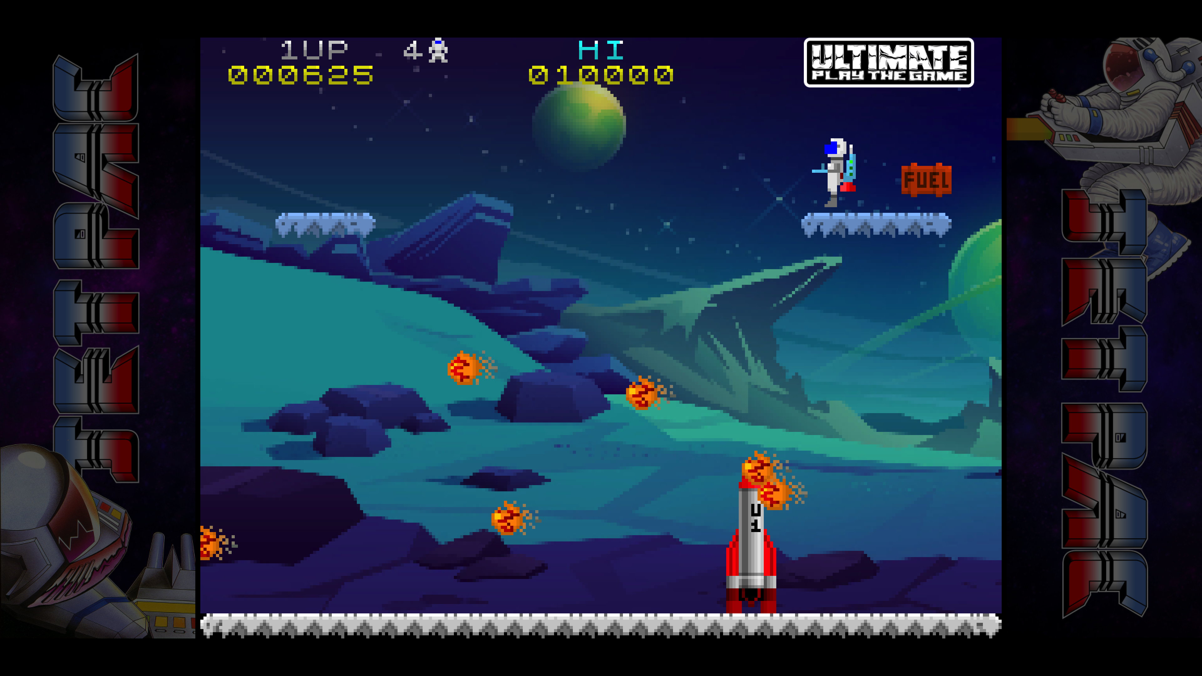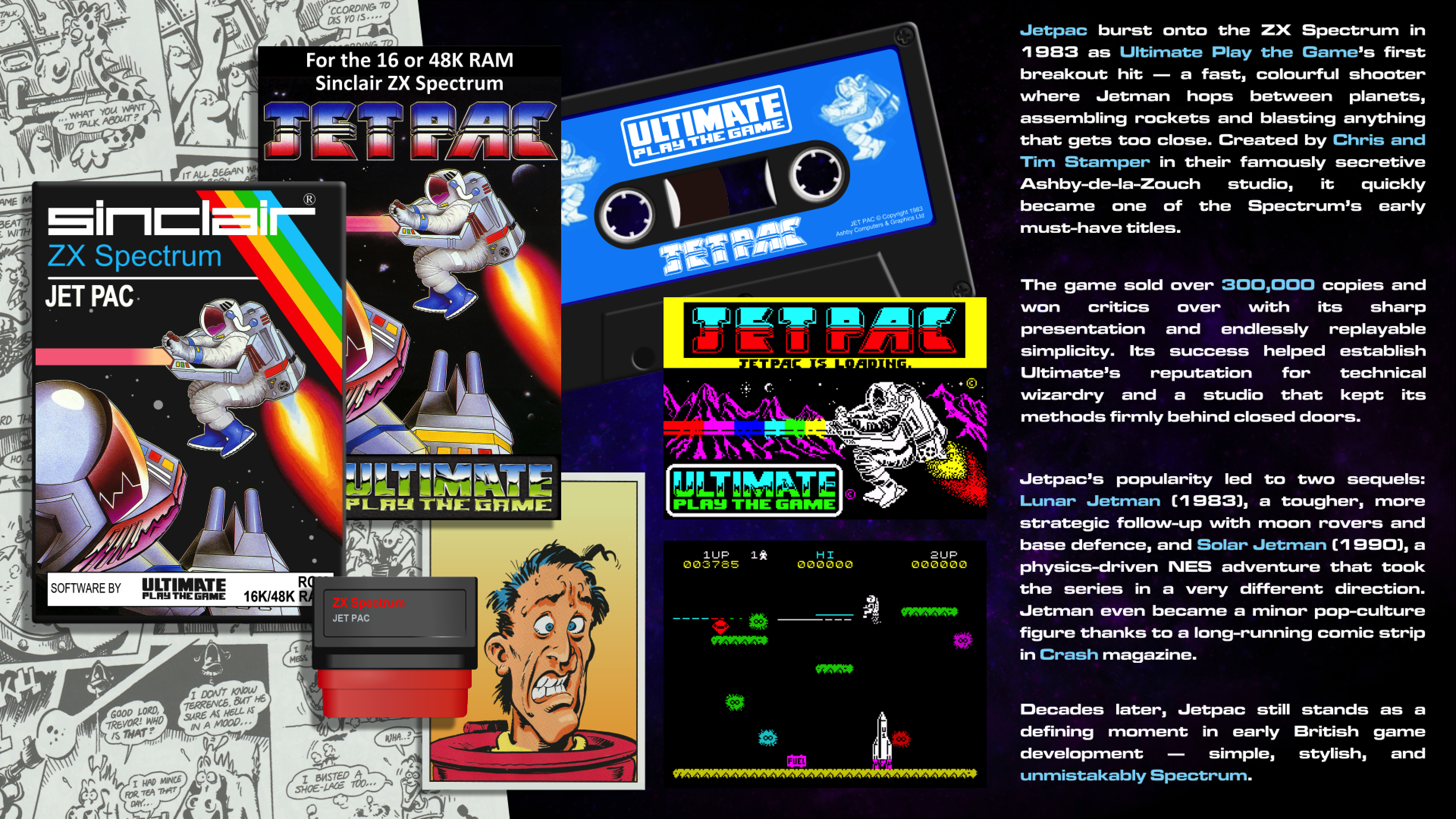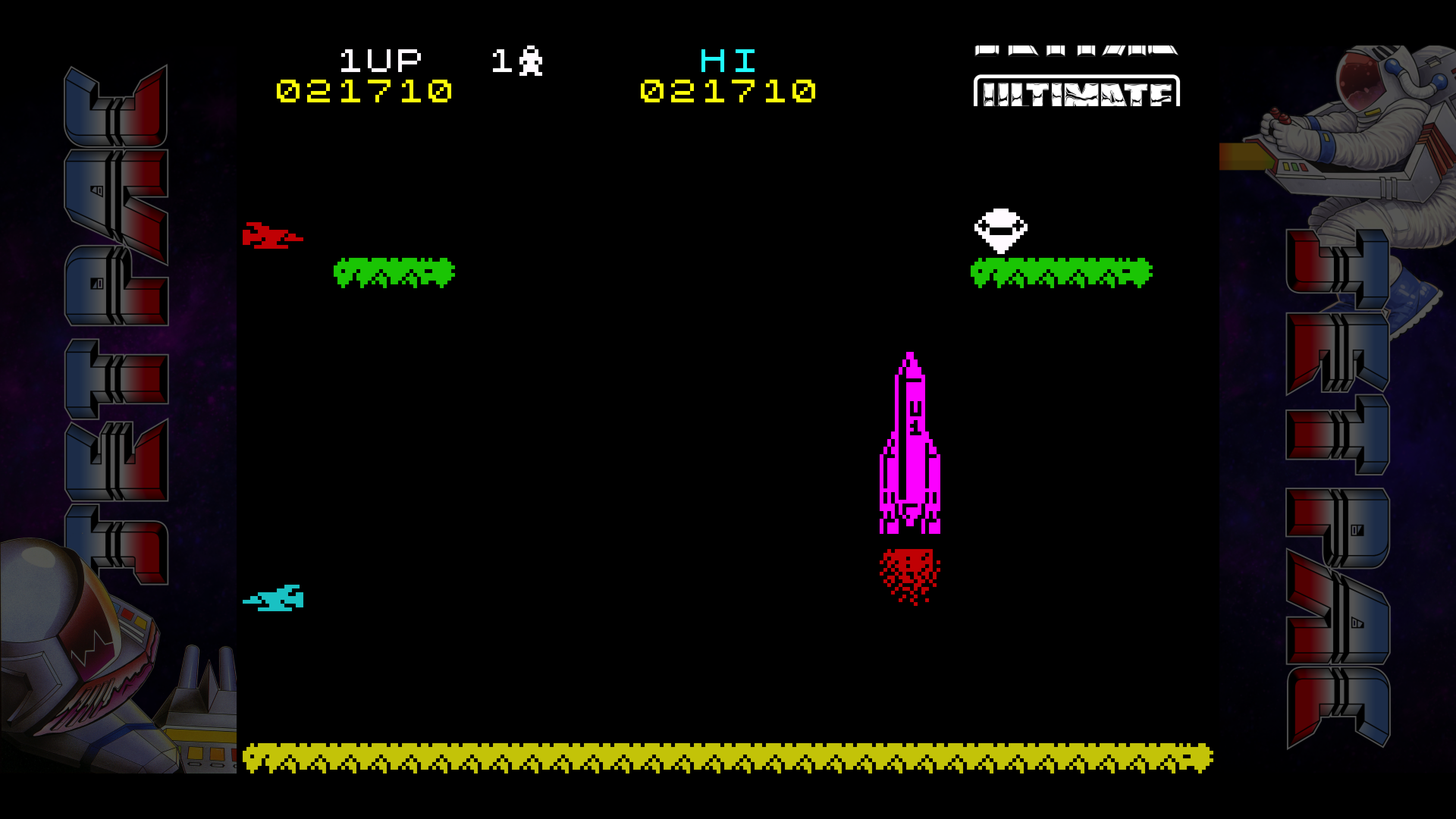 Как водится, разработчик оставил в неприкосновенности геймплей (да, физика джетпака отличается, но не принципиально), но значительно улучшил графику и звук. Более того, теперь нас ждёт не два, а три графических стиля: классический а-ля «Спектрум», современный и промежуточный третий — с пикселявой, но более красочной графикой. Переключаться между режимами можно клавишей Tab, а при желании можно включить сканлайны — клавишей «S».