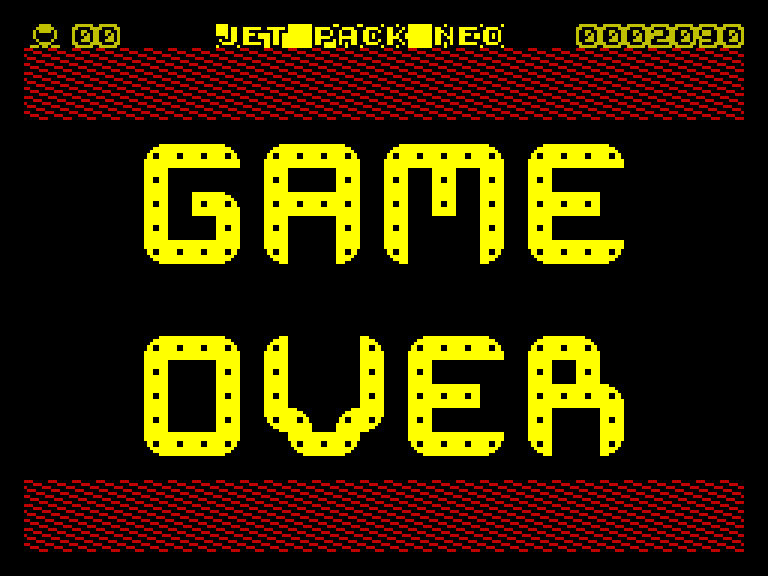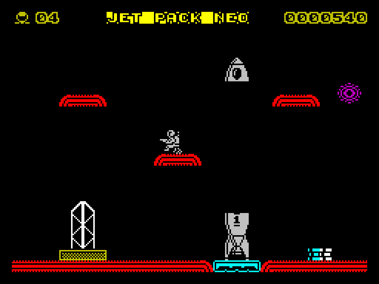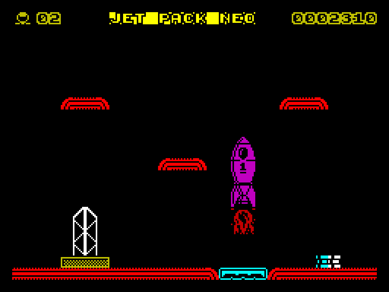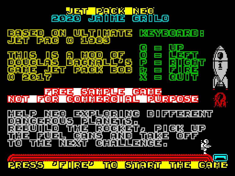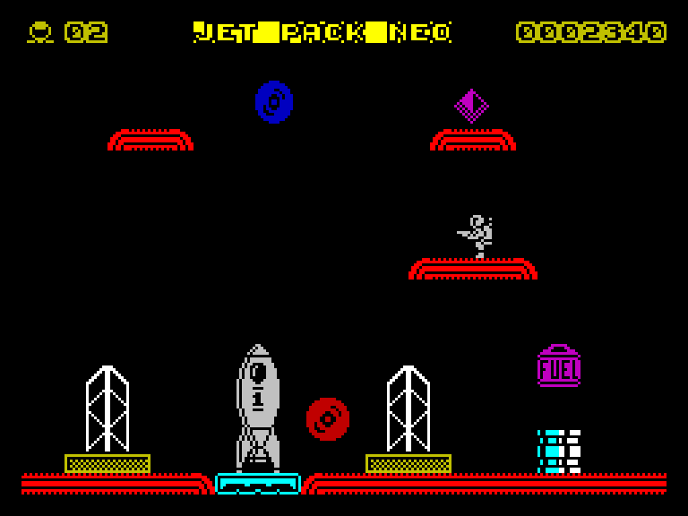Очередной клон JetPac, но теперь на движке AGD и за авторством Джейми Грило. Стрелять можно только одиночными выстрелами, космонавт больше не умеет парить в воздухе, при подлёте к краю экрана оттуда всё-таки может вылететь враг, а при попадании в канистру с валяющуюся вдалеке горючим почему-то тает запас топлива в вашей ракете. В общем, Джейми в своём репертуаре, поэтому лучше поставьте JetPac RX.
