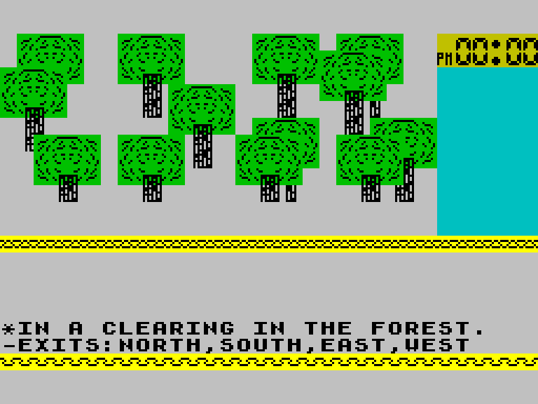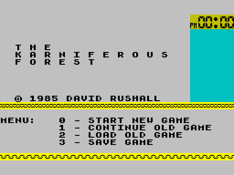 Текстовый квест с не очень разнообразными, но многочисленными иллюстрациями (каждая генерируется из отдельных спрайтов). В игре вы бродите по лесу, пытаясь найти из него выход и не нарваться на какого-нибудь орка. Команды почему-то вводятся с жуткой задержкой, что не очень выгодно отличает Karniferous Forest от других квестов.