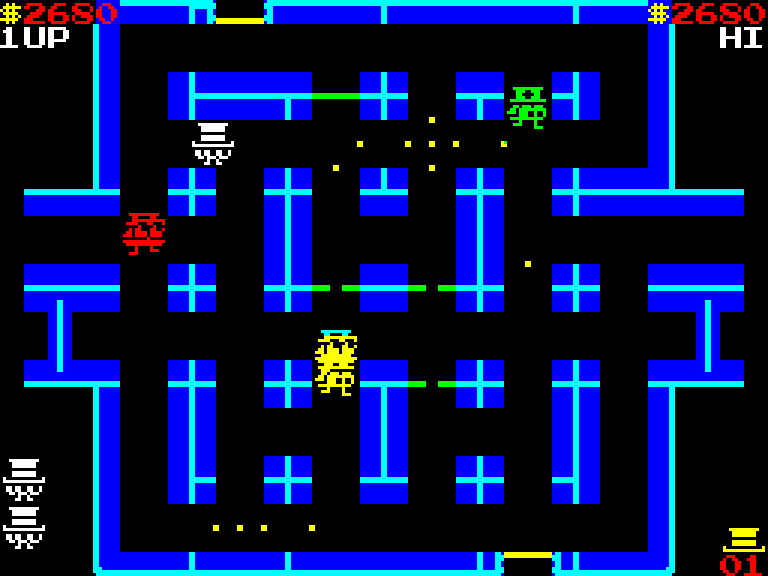Основная цель Lock'n'Chase — собрать все предметы на уровне (здесь это монетки), но за вами бегают не привидения, а полицейские. Потому что нашего героя зовут Люпен, и он, разумеется, прямо сейчас грабит банк. Главная защита от стражей порядка — стены, которые можно возводить в определённых местах, нажимая кнопку «огонь». Эти места отчётливо видны на экране — не запутаешься.