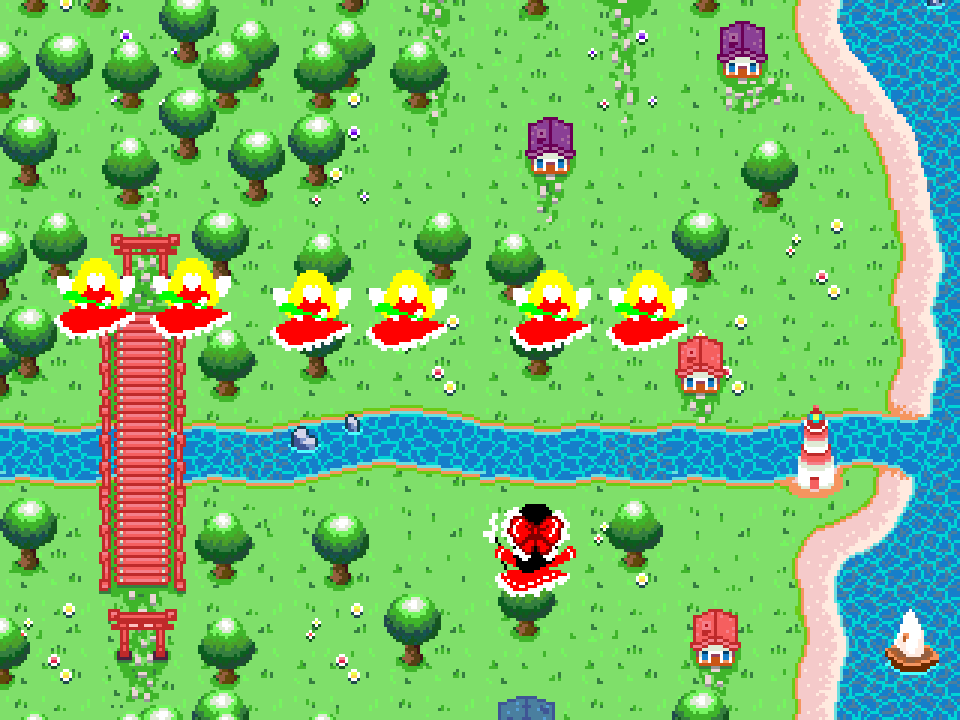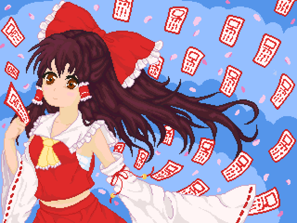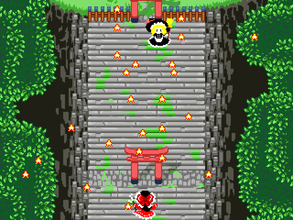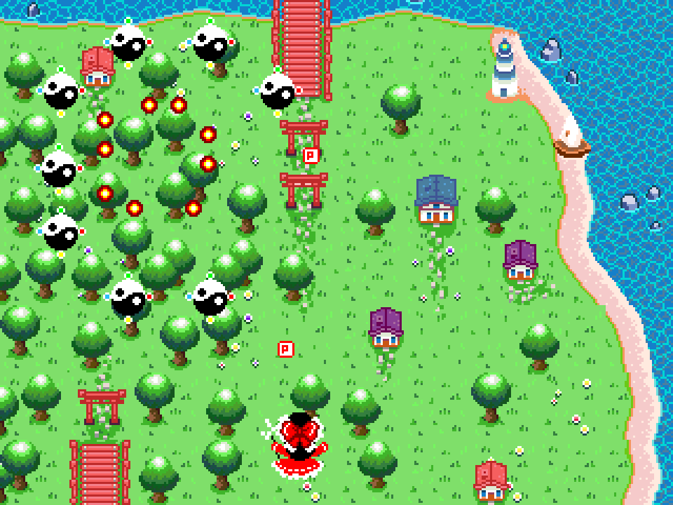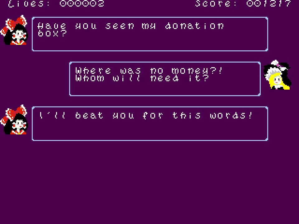 Здесь за главную героиню — девушка по имени Рейму, у которой кто-то спёр ящик для пожертвований, и теперь она пытается его вернуть, паря в своём красном платье над красивыми пейзажами и поливая встречных-поперечных почём зря какими-то хитрыми символами. Играется всё это, впрочем, довольно традиционно и увлекательно — летаем, стреляем, уворачиваемся от вражеских выстрелов и стараемся не помереть как можно дольше.