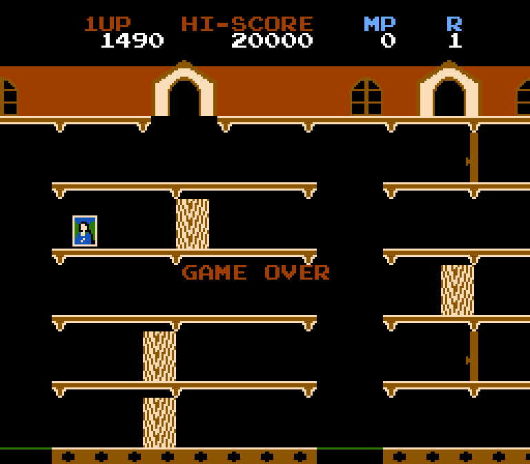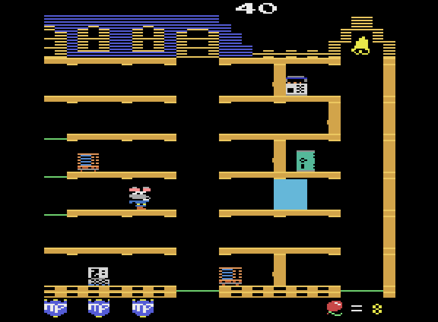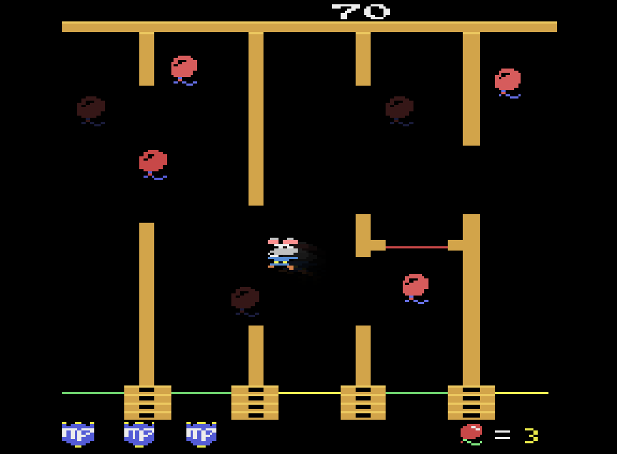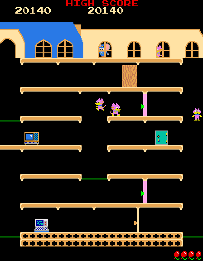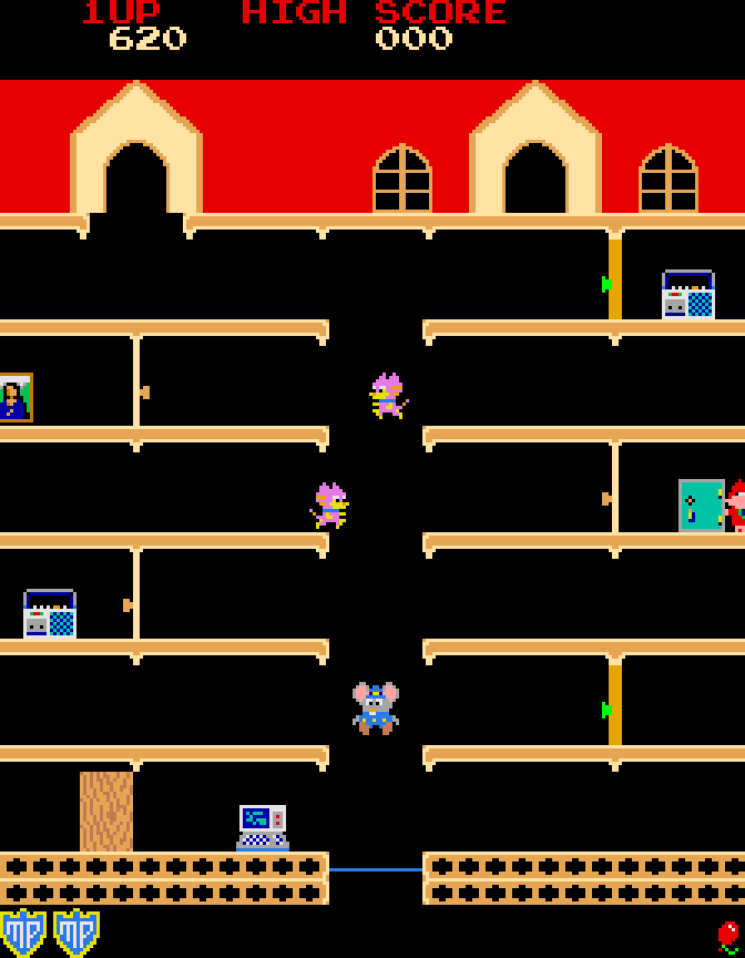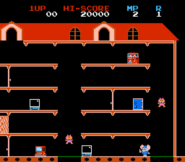 Вы управляете мышонком-полицейским по имени Маппи, которому нужно собрать ценные вещи (электронику) из дома, полного котов. За вами гоняется банда из пяти розовых котов. Единственная ваша защита от котов — двери: некоторые из них могут оглушить или отбросить преследователей. Перемещаться между этажами можно, подпрыгивая на батуте.