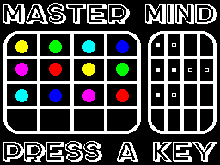 Это довольно популярная игра, один из вариантов которой известен у нас как «Быки и коровы». Конкретно в Master Mind компьютер загадывает последовательность из 4 цветов, а вы должны её угадать. Жмите цифры от 1 до 6, чтобы расставлять цветные фишки, а компьютер будет давать вам подсказки: