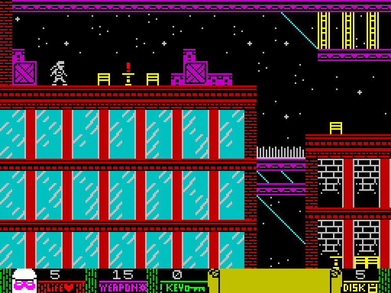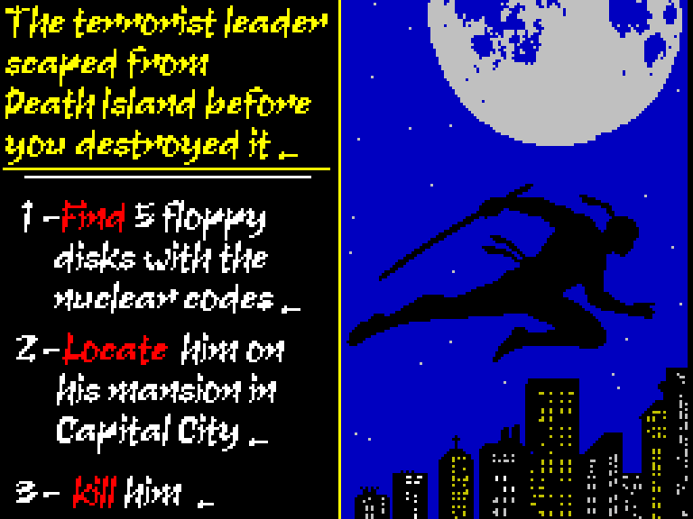 Лидер террористов сбежал с Острова Смерти до того, как игрок уничтожил его. Миссия состоит из трёх задач: найти 5 дискет с ядерными кодами, обнаружить его в особняке в Столичном Городе и убить его. Секретный агент-ниндзя возвращается. Экшен-платформер с управлением Q — прыжок/подъём по лестнице, A — вниз/спуск по лестнице, O/P — движение влево/вправо, пробел — метание сюрикенов. Игрок собирает предметы: сюрикены, жизни, ключи для зелёных дверей и дискеты. Враги включают солдат, дронов, роботов, психоглазы, мотоциклистов, бомбы и лидера террористов.