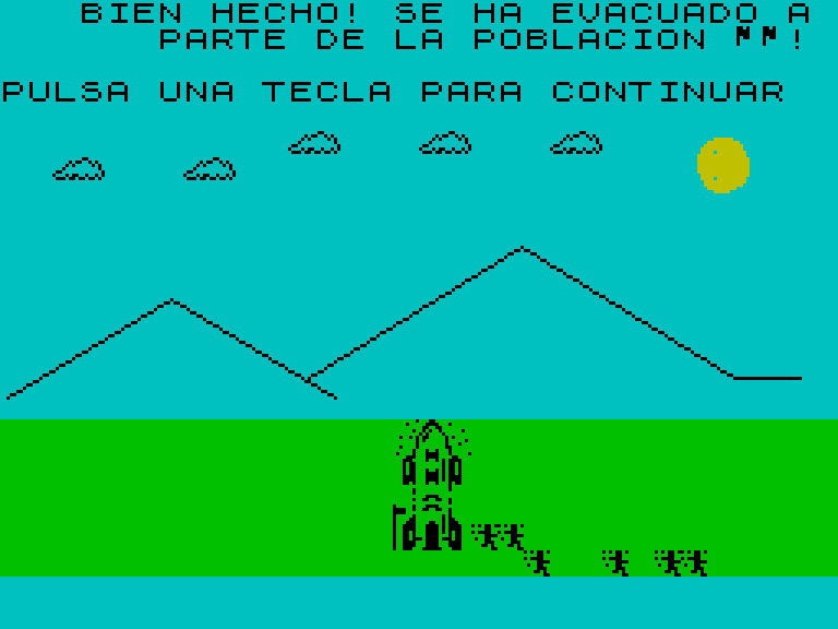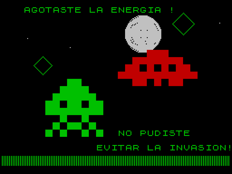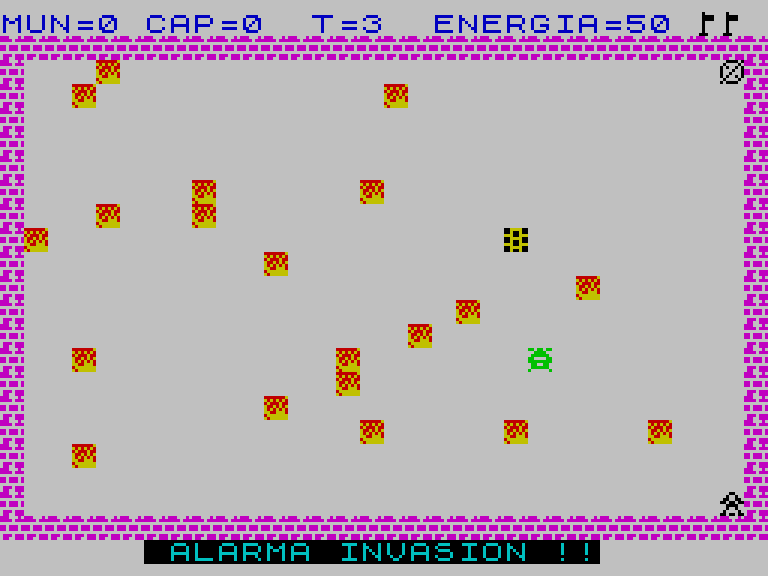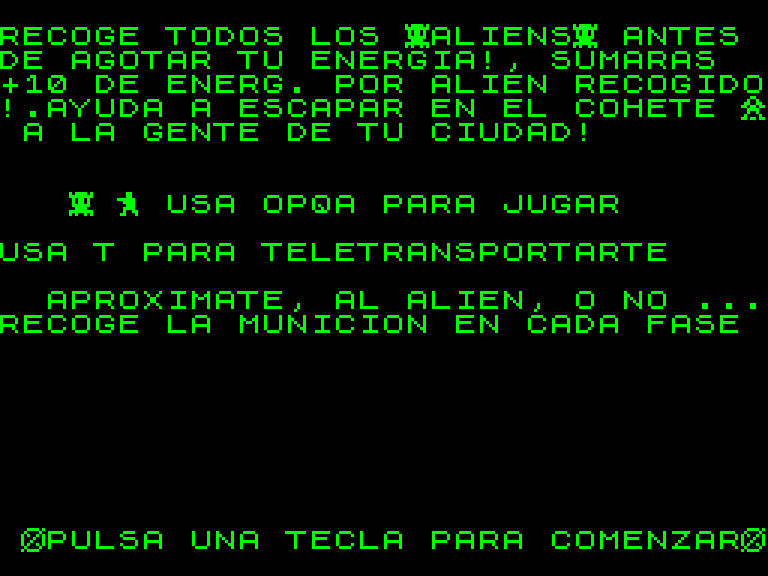 Игра про спасение землян от вторгшихся на землю инопланетян. Вы управляете солдатом, который бегает по экрану и лично убивает пришельцев, давая время группе людей добежать до спасательной ракеты. Каждый ход тратит 1 единицу энергии (изначально их 50), а каждый убитый инопланетянин пополняет её на 10 единиц.