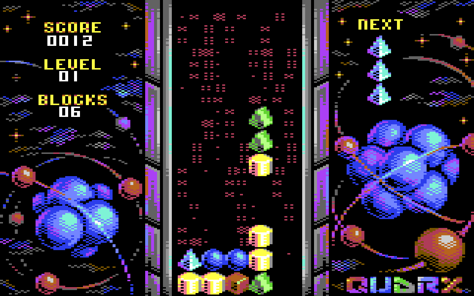 Игра называется Quarx и является клоном аркадной головоломки Xixit, которая изначально выходила на PC. Строго говоря, сама Xixit — чистейший клон Columns. Здесь в колодец тоже падают вертикальные фигурки из трёх цветных блоков: их нужно расставлять так, чтобы образовывались горизонтальные, вертикальные и диагональные линии из блоков одного цвета. Порядок цветных блоков в падающей фигурке можно менять, а ещё — перемещать их влево-вправо и ускорять падение.