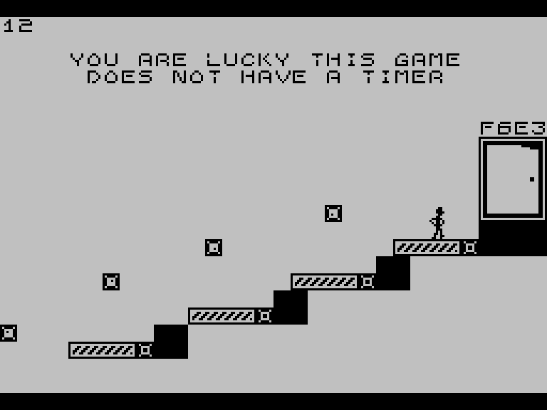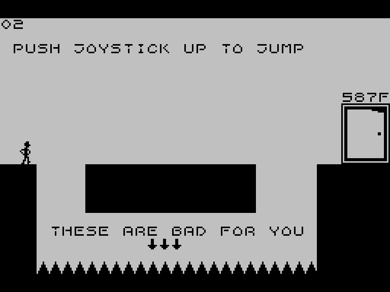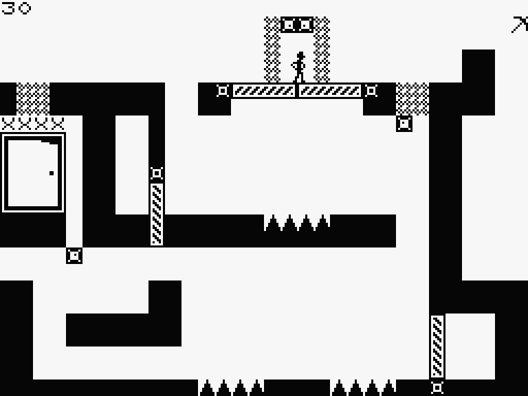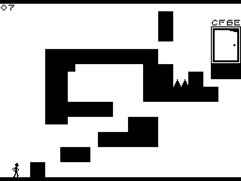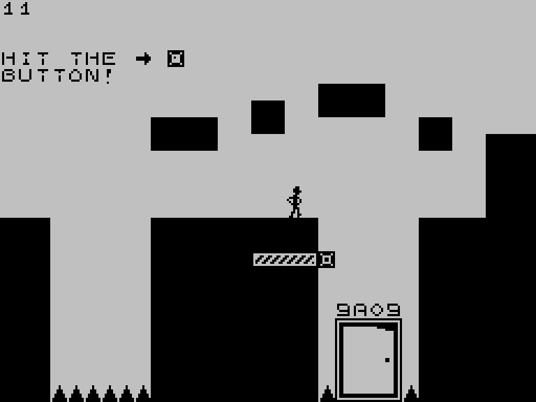 В этой головоломке вам нужно управлять схематично нарисованным человечком и на каждом экране добегать или допрыгивать до выхода, который обозначен дверью с кодом (его, кстати, можно ввести на старте, чтобы сразу попасть на нужный уровень).