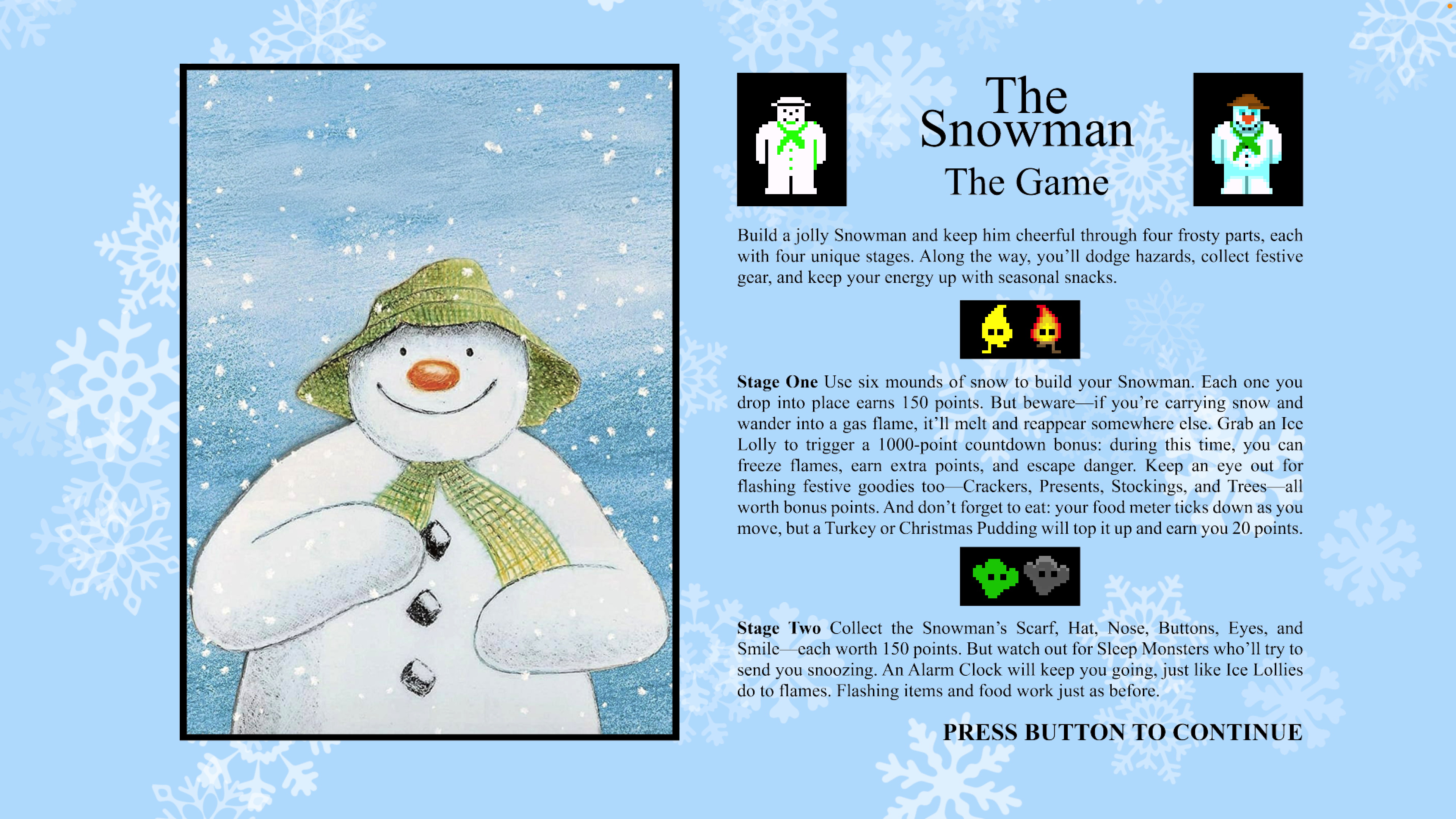 Суть этой аркады очень простая. На первом этапе надо собрать снеговика из горок снега, стараясь не сталкиваться с огоньками и не падать с большой высоты. На втором и третьем этапе снеговика нужно украшать: шляпой, шарфом, пуговицами и так далее. Наконец, на четвёртом этапе снеговик уже готов, но может растаять, поэтому нужно охлаждать его кубиками льда. Разумеется, враги присутствуют на всех этапах, с ними надо поаккуратнее. А ещё на экране постоянно появляются всякие бонусы — их можно брать, чтобы заработать больше очков или поправить здоровье.