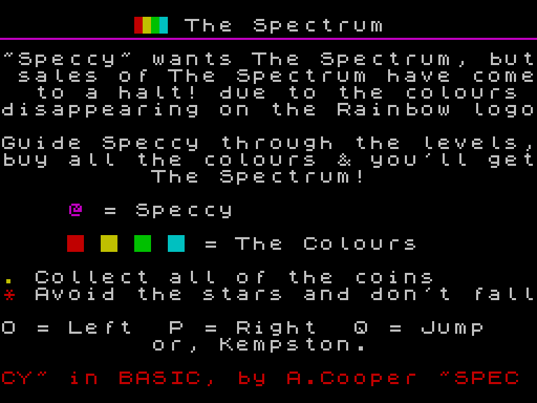 Платформер, написанный на Бейсике. Разумеется, страшно тормозит и выглядит слишком ностальгично — нет даже UDG. Очень сильно на любителя.