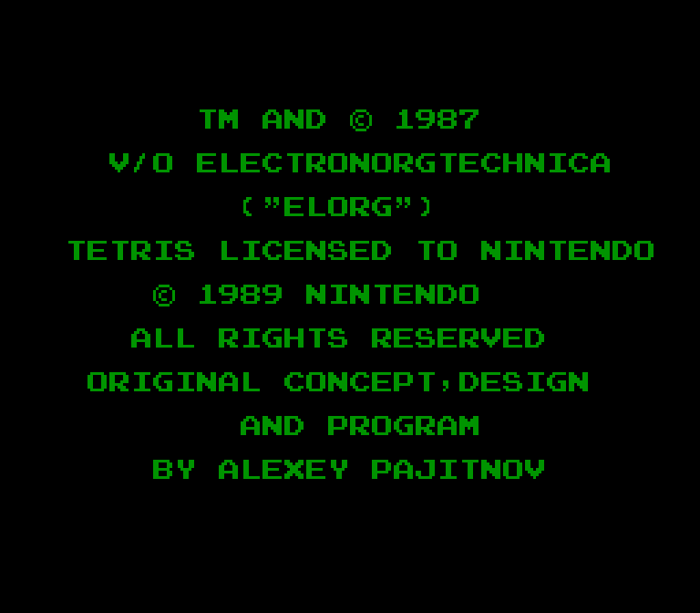 Ещё один мод, превращающий вашу NES в компьютер «Электроника-60». Изображение снова чёрно-зелёное, а тетрамино изображены квадратными скобками. Но здесь явно приложено меньше стараний для достижения аутентичной картинки.