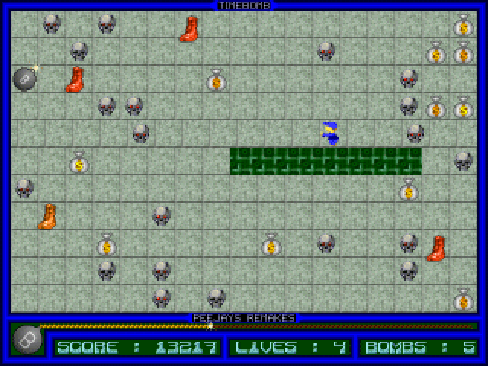 Back in 1984, a small software company, CDS Microsystems, released Timebomb for the 16K Spectrum. It required basic puzzle solving combined with arcade game reflexes, and, despite its very simplistic graphics and awful rendition of Fur Elise, it had a huge following. The idea is very simple - defuse the bombs before the timer reaches zero and the bomb goes off. In doing so, however, the squares you walk on disappear, so you can't directly retrace your steps. You can also collect bonus points, but must avoid walking on the skulls or the moving baddies from level 2 onwards. You can also scroll the whole row of tiles you are standing on if there are no moving baddies on the row, and the game features full wraparound, adding an extra element to the puzzle.