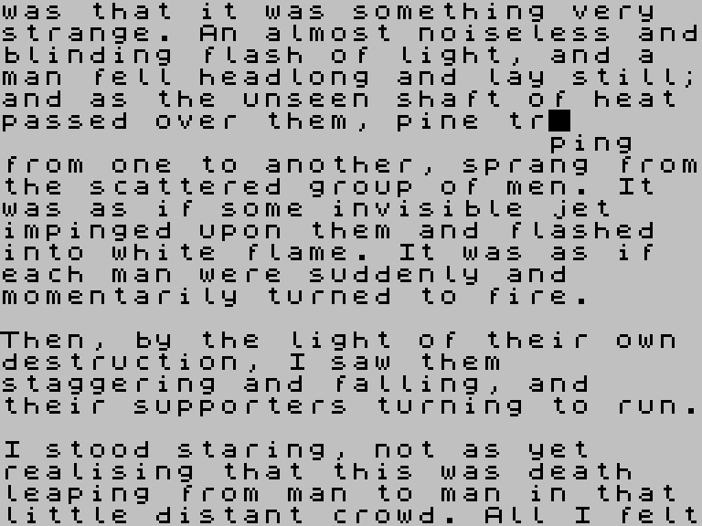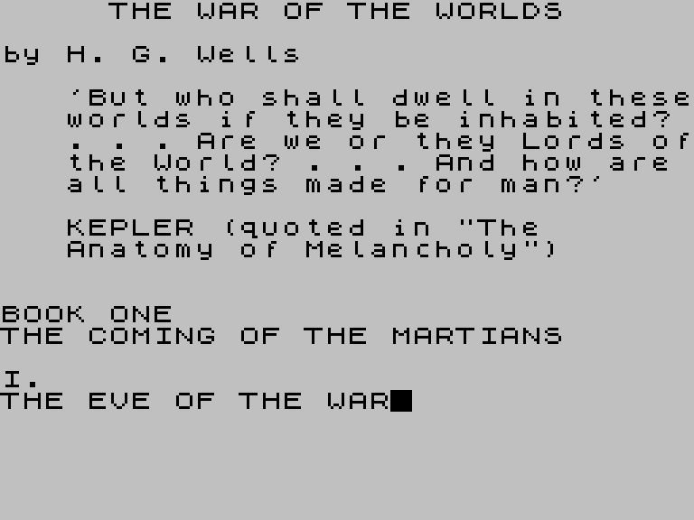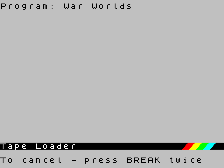 Забавная программа с длинным названием The War of the Worlds: A Dynamic Tape Loader for Fast Readers выводит полный текст знаменитой «Войны миров» Герберта Уэллса прямо во время загрузки с кассеты.