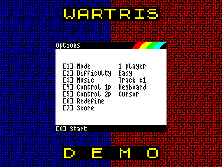 В режиме на одного игрока Wartris похожа на самый обычный тетрис: к сожалению, не самый отзывчивый на свете (видимо, сказывается тот факт, что игра написана на Boriel's BASIC), со странным выбором скорости (тут вместо неё три уровня сложности), отсутствием возможности вращать фигуры против часовой стрелки, отсутствием «моментального падения» фигуры и прочими проблемами.