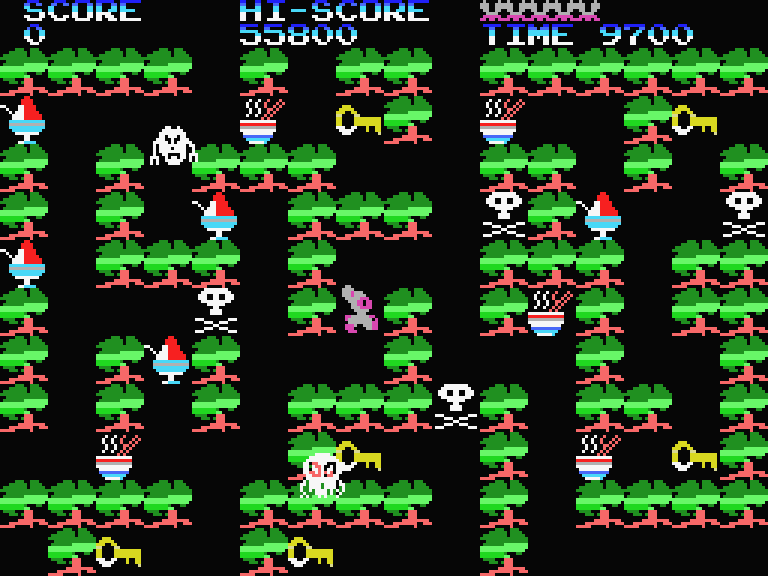 По дороге можно наткнуться на тарелку лапши или порцию мороженого — странности, которые здесь кажутся уместными. Управляя персонажем по лесному лабиринту с четырёхсторонней прокруткой экрана, вы стремитесь набрать как можно больше очков. Для запуска игры нужно «вставить монетку» на титульном экране. Всё это сопровождается простой, но приятной фоновой мелодией, воспроизводимой через PSG, — классика для MSX1.