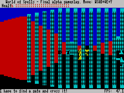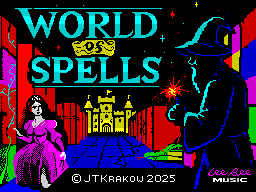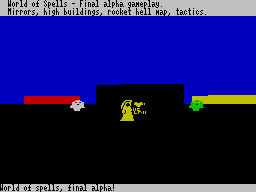 Самое любопытное в World of Spells — это действительно движок: он выдаёт приличную цветную картинку с залитыми (а иногда даже псевдо-текстутированными) стенами, показывая при этом непривычно высокую для ZX Spectrum частоту кадров в секунду. Иногда она доходит до 80, редко опускается ниже 30, а ниже 20 падает, только когда на экране находится много стен и спрайтов одновременно. Такое даже вашему новенькому компьютеру с RTX 5090 не всегда по силам!