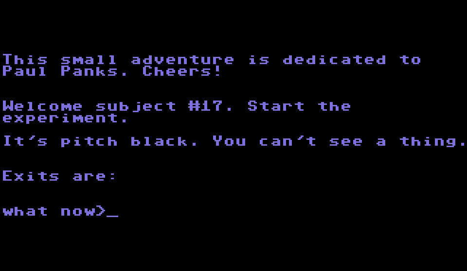 Текстовый квест, в котором задача ровно одна — выбраться из запертой комнаты. Игра простая и короткая, но это не противоречит правилам конкурса, а значит, не является помехой для получения удовольствия.
