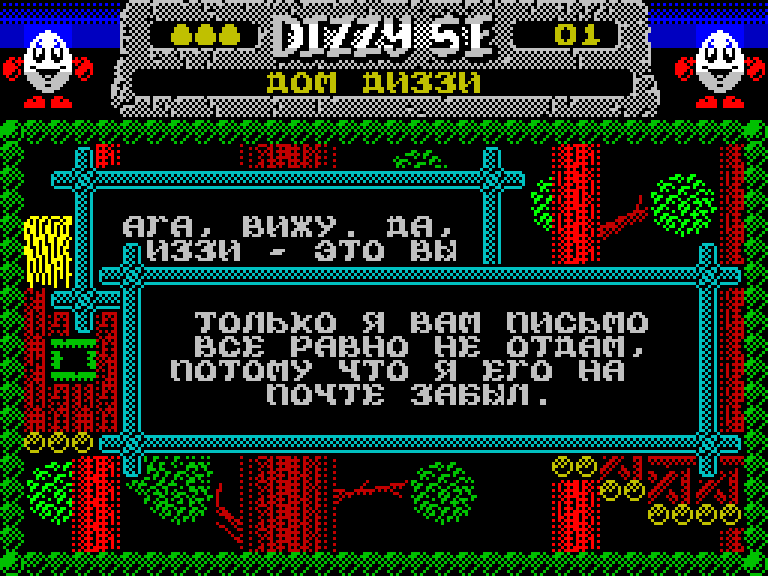 Игра называется Dizzy and the Mystical Letter, а повествование начинается с того, что почтальон Печкин приносит Диззи загадочное письмо, которое он ему, разумеется, не отдаст, потому что у того документов нету. Как несложно догадаться, подобных отечественных кросс-культурных отсылок в игре хватает, хотя помимо русской версии, существует и английская. Удачи нашим зарубежным друзьям понять, кто такой Печкин, и почему он, нехороший человек, не хочет отдавать письмо адресату.