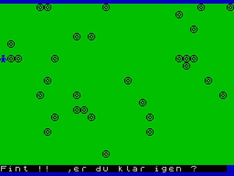 Управление — курсор-джойстик, то есть клавиши «5», «6», «7» и «8». В самом начале можно выбрать уровень сложности, то бишь количество непробиваемых стен. Увы, алгоритм генерации этих самых стен у игры так себе, так что легко можно наткнуться на ситуацию, когда игру просто нельзя пройти.