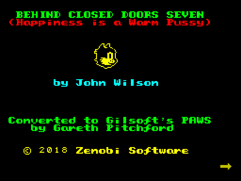 Отдалённо похожая ситуация случилась и с новой игрой — Behind Closed Doors 7: Happiness Is A Warm Pussy. Первые четыре части этой саги выходили на ZX Spectrum, но последующие три на этом компьютере уже не появлялись. Видимо, сейчас Zenobi решила исправить это недоразумение, но начала почему-то не с пятого эпизода, а сразу с седьмого. Видимо, две предыдущие игры появятся чуть позднее.