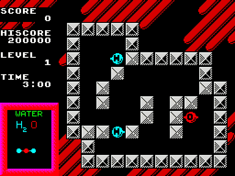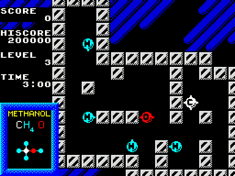 Ещё одна игра прибыла на конкурс ZX Dev MIA - Remakes — головоломка Atomix, в которой нужно собирать молекулы из отдельных атомов. Проблема в том, что атомы перемещаются не по клеткам, а строго до ближайшей стены или другого атома, так что иногда соединить все эти элементы в один очень непросто.