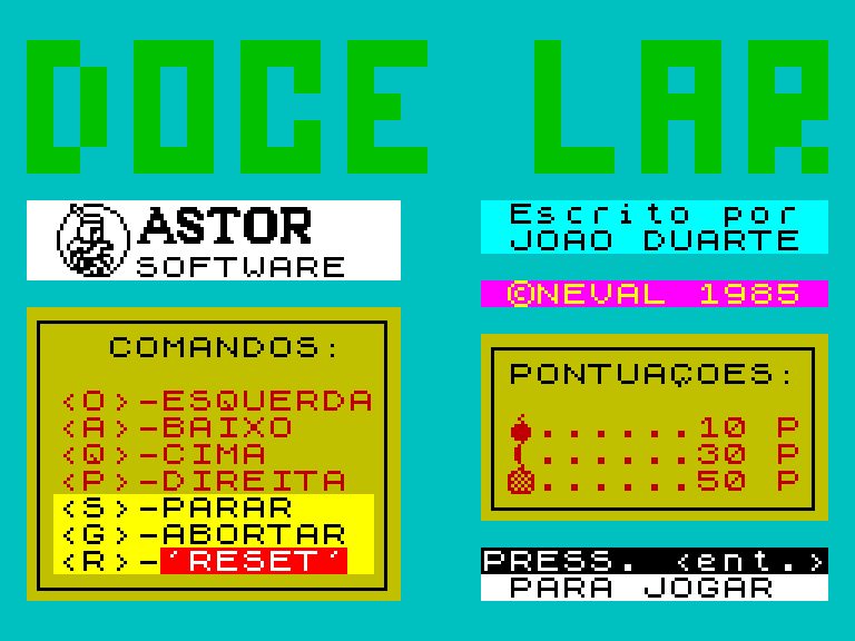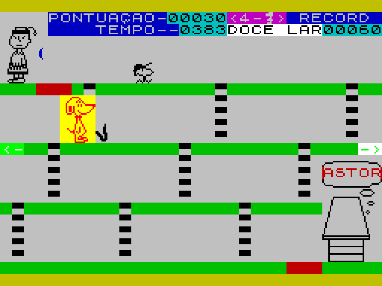 Очередная находка называется Doce Lar, и это аркада, в которой вы управляете собачкой, бегающей по экрану и таскающей яблоки к себе в конуру. Фрукты вам выдаёт хозяин (или какой-то знакомый мужик), который находится в левой верхней части экрана. К сожалению, конура располагается в правой нижней, что несколько затрудняет процесс обогащения. Экран разделён на три этажа, между которыми расположены лестницы. По этим этажам ползают змеи и кроты (или это крото-змеи?), которых становится больше с каждым успешно утащенным яблоком.