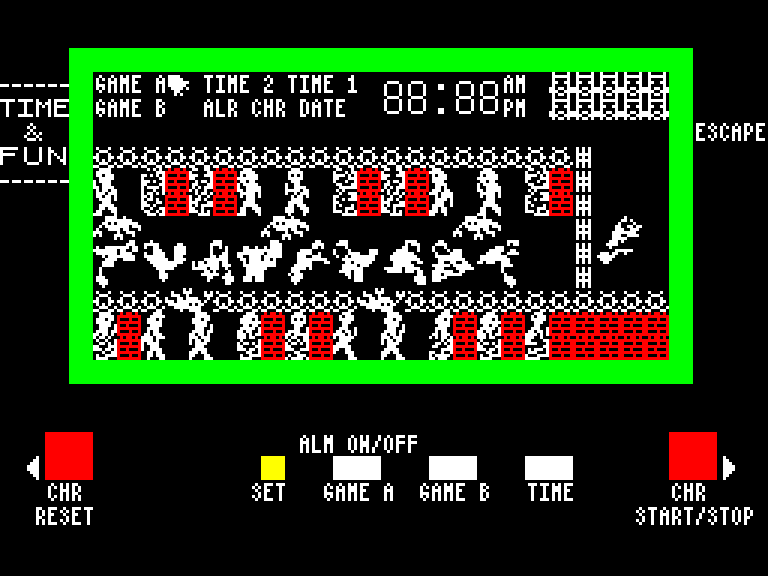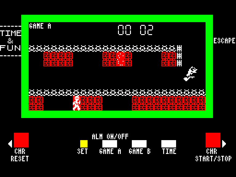 Escape — спектрумовская версия карманной электронной игры от компании VTech. Суть та же — нужно убежать из тюрьмы (или из концлагеря?), не попавшись в лапы к охранникам. Для этого нужно всего лишь не оказываться с ними рядом на открытом пространстве, а перемещаться лишь когда их нет рядом или они ходят за стенами.