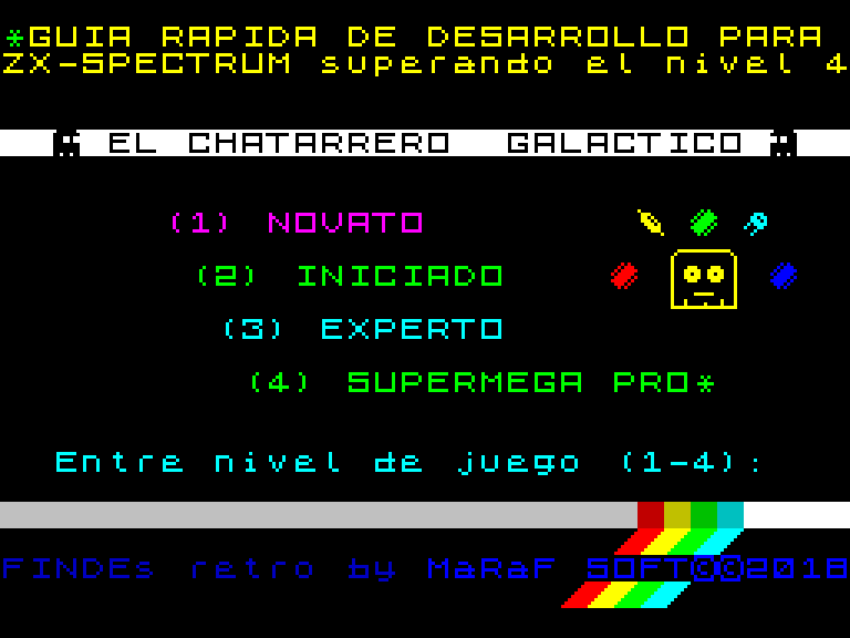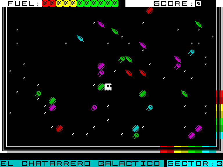Ну а нас интересует три игры, которые Рафа создал в качестве примера. Они объединены в трилогию El Chatarrero Galáctico и даже связаны каким-то общим сюжетом — его, опять таки, можно изучить по вышеприведённой ссылке. Сами игры очень простенькие, но работают шустро — спасибо компилятору Mcoder 3.